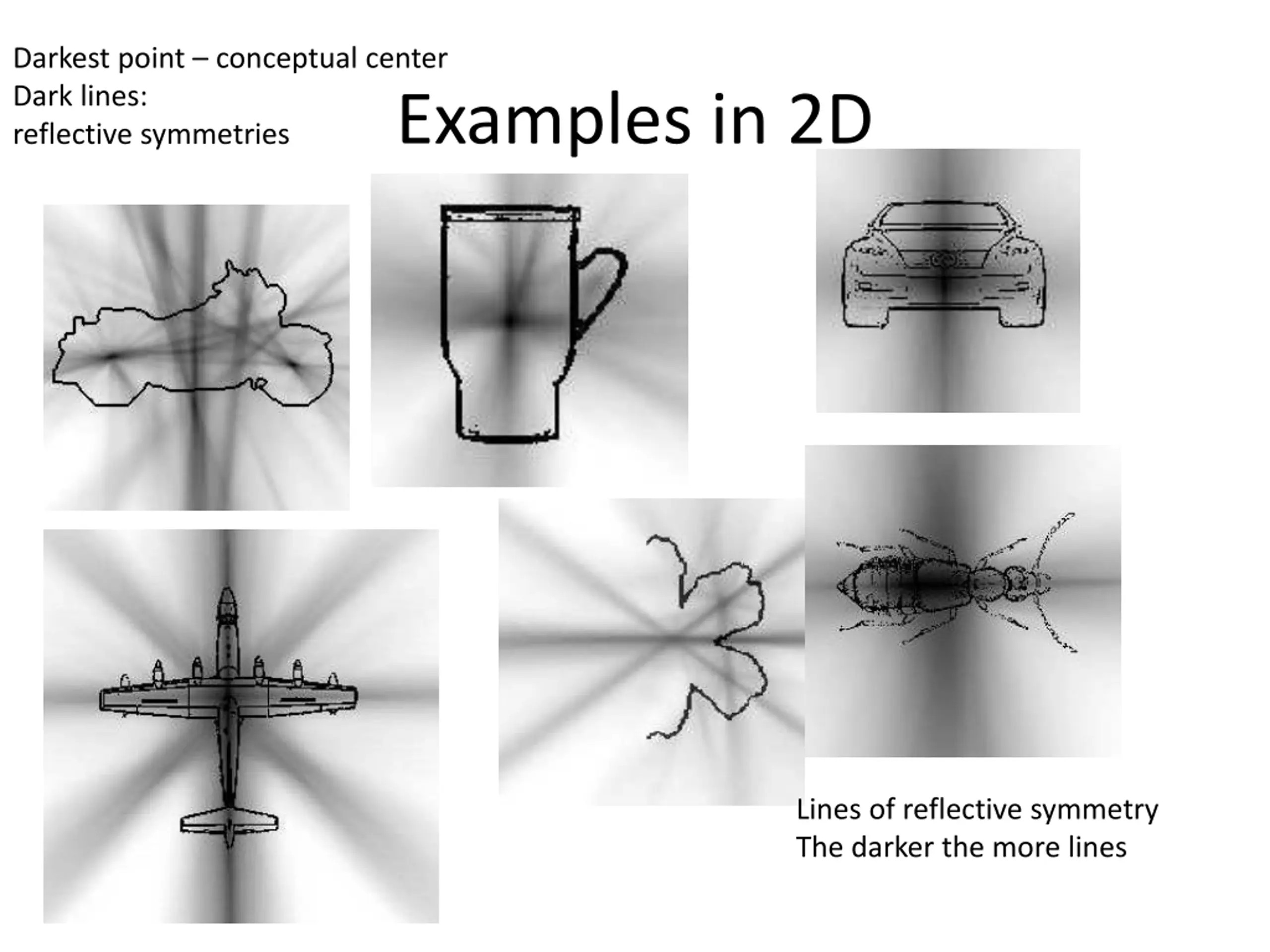 Darkest point conceptual center Dark lines: reflective symmetries Examples in 2D Lines of reflective symmetry The darker the more lines