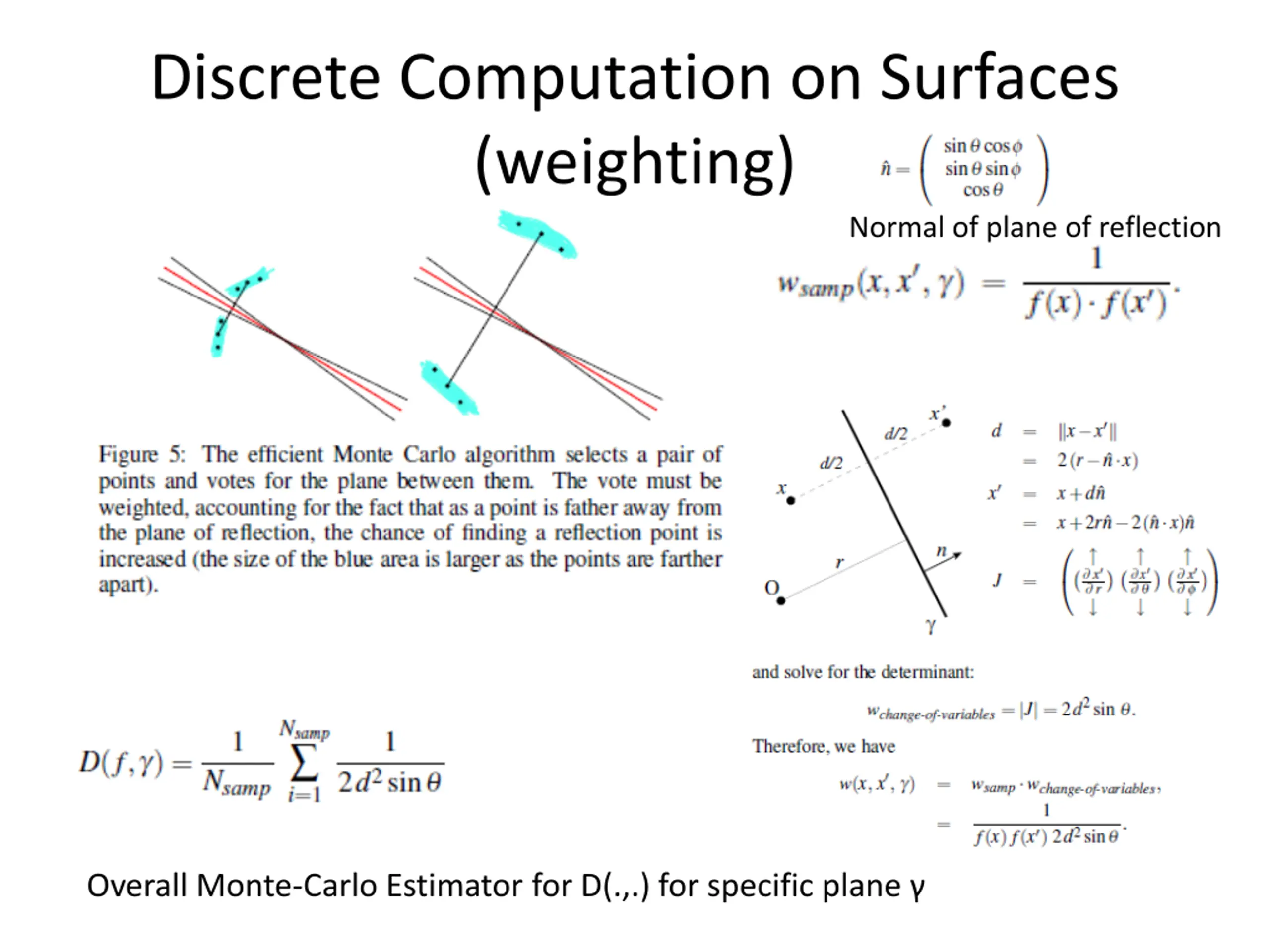 Discrete Computation on Surfaces (weighting) Normal of plane of reflection Overall Monte-Carlo Estimator for D(.,.) for specific plane