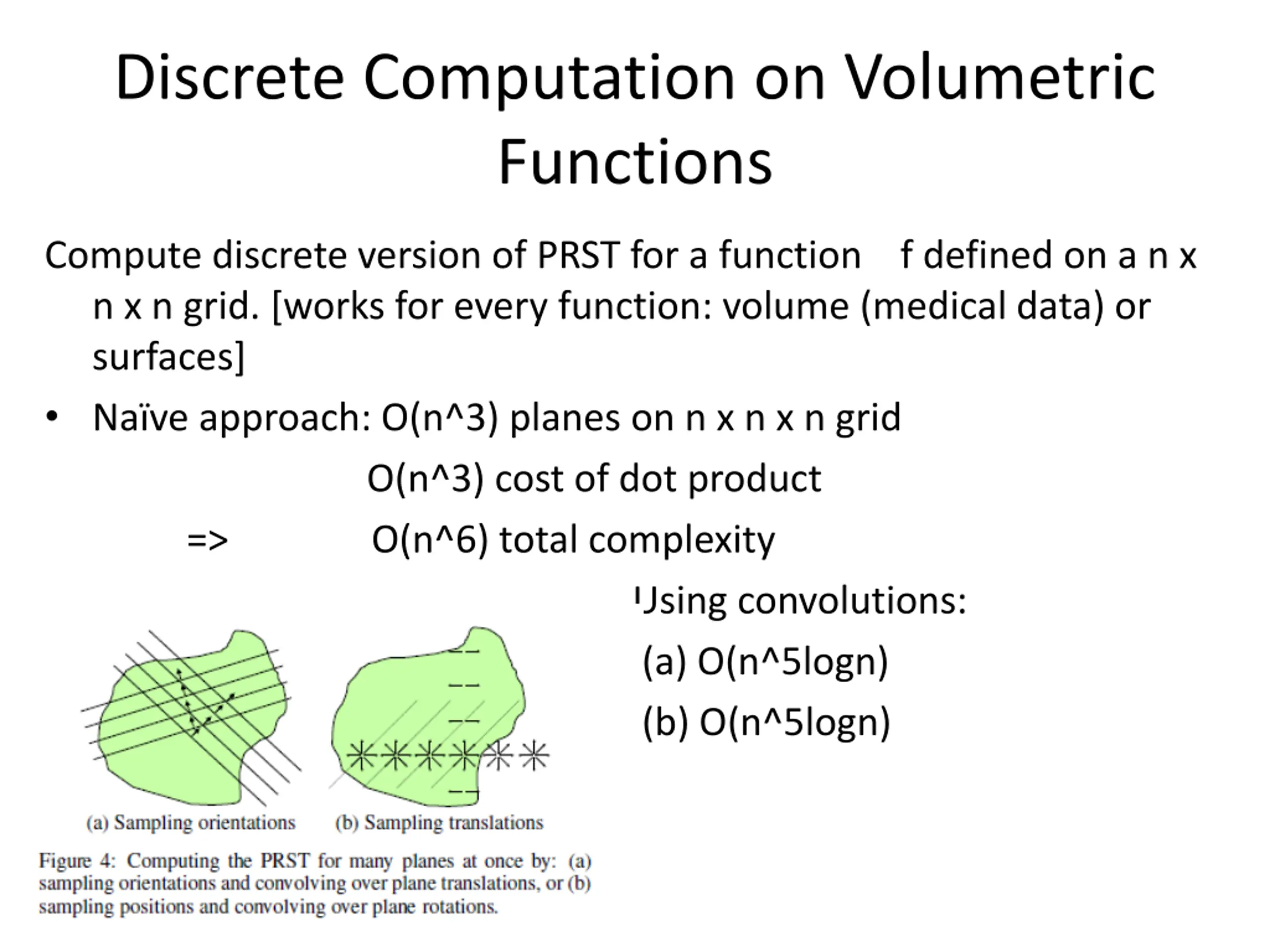 Discrete Computation on Volumetric Functions Compute discrete version of PRST for a function f defined on a n x n x n grid. [works for every function: volume (medical data) or surfaces] Na ve approach: O(n^3) planes on n x n x n grid O(n^3) cost of dot product => O(n^6) total complexity Using convolutions: (a) O(n^5logn) (b) O(n^5logn)