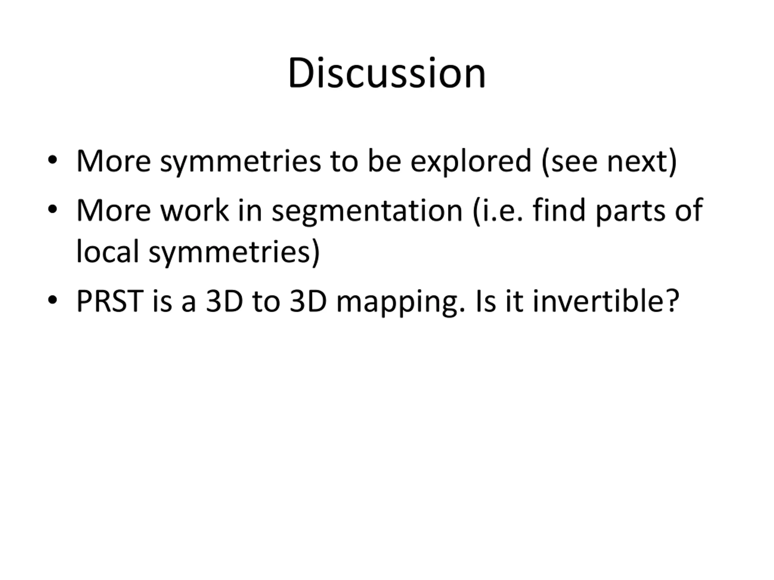 Discussion More symmetries to be explored (see next) More work in segmentation (i.e. find parts of local symmetries) PRST is a 3D to 3D mapping. Is it invertible?