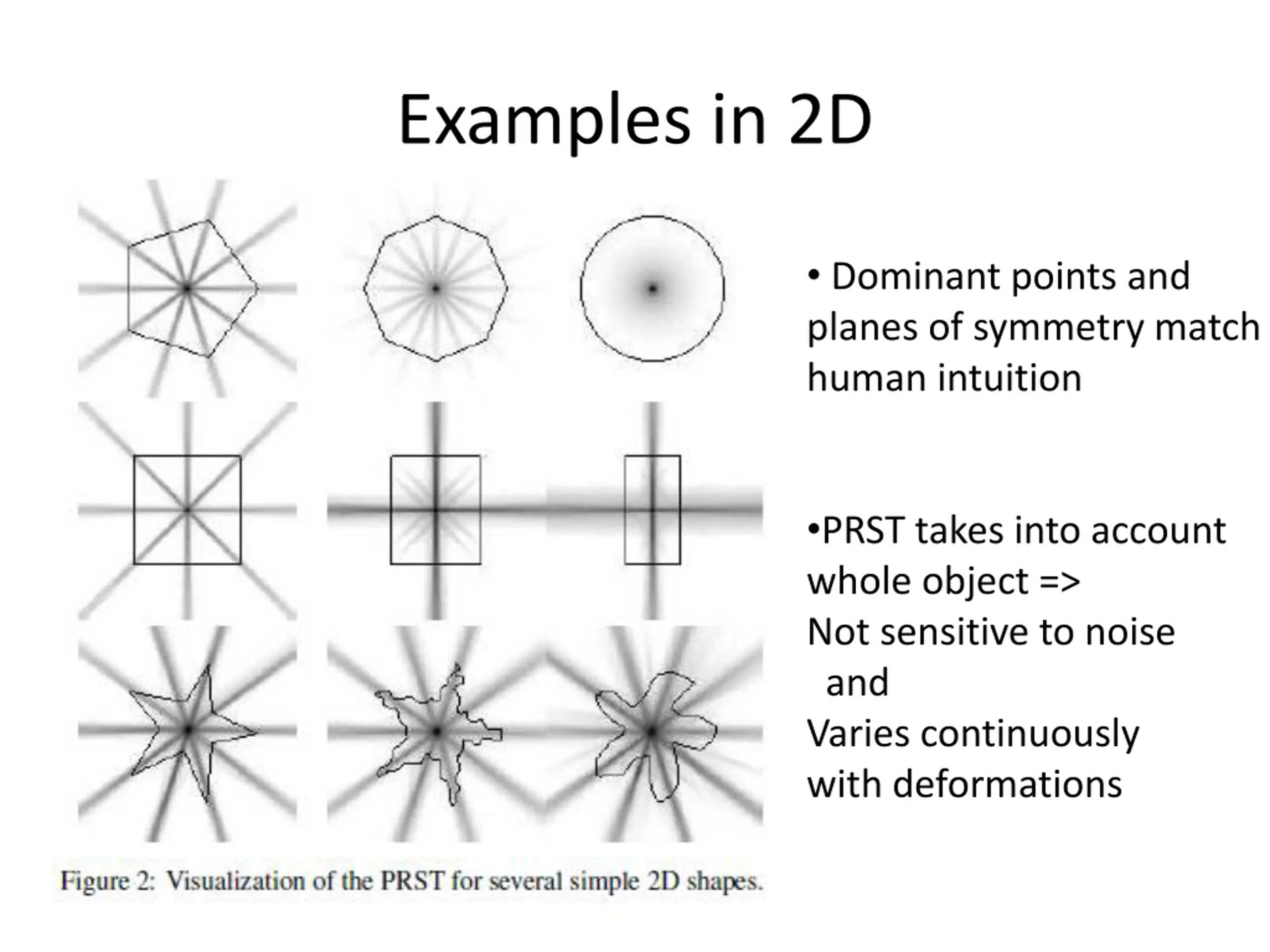 Examples in 2D Dominant points and planes of symmetry match human intuition PRST takes into account whole object => Not sensitive to noise and Varies continuously with deformations