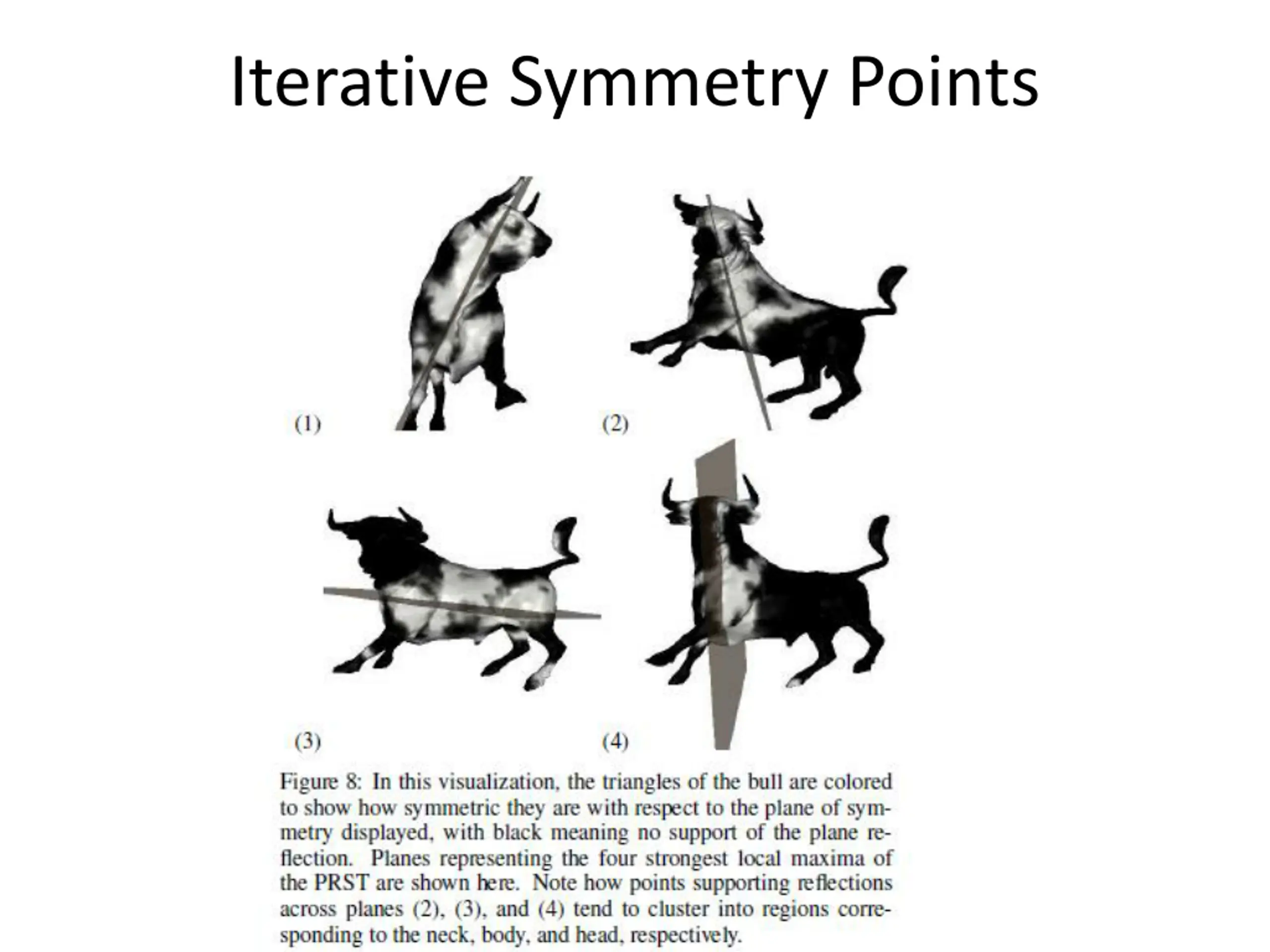 Viewpoint Selection Minimize amount of symmetry in viewing direction (why?) For each plane at maxima of PSRT preferred viewing direction is normal to it Viewpoint score for a viewing direction v: Where u is a plane of local symmetry and M(u) is the symmetry score Do exhaustive search in set of viewing directions