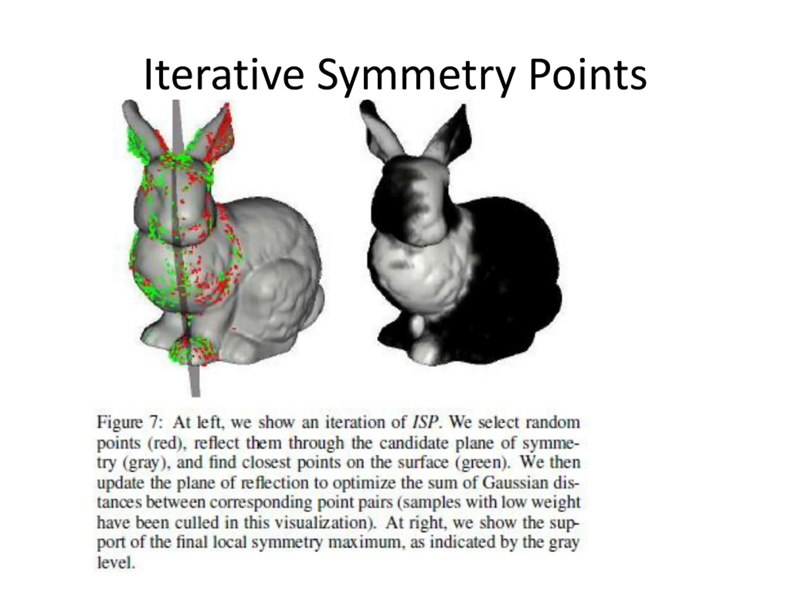Continuous Refinement of Local Maxima Refine using Iterative Symmetric Points (ISA) Inspired by ICP For each discrete local maximum (symmetry plane ): Select a random of points on the model Reflect points around Find closest points on mesh Solve for new plane that minimized distances Use GEDT distance function Repeat