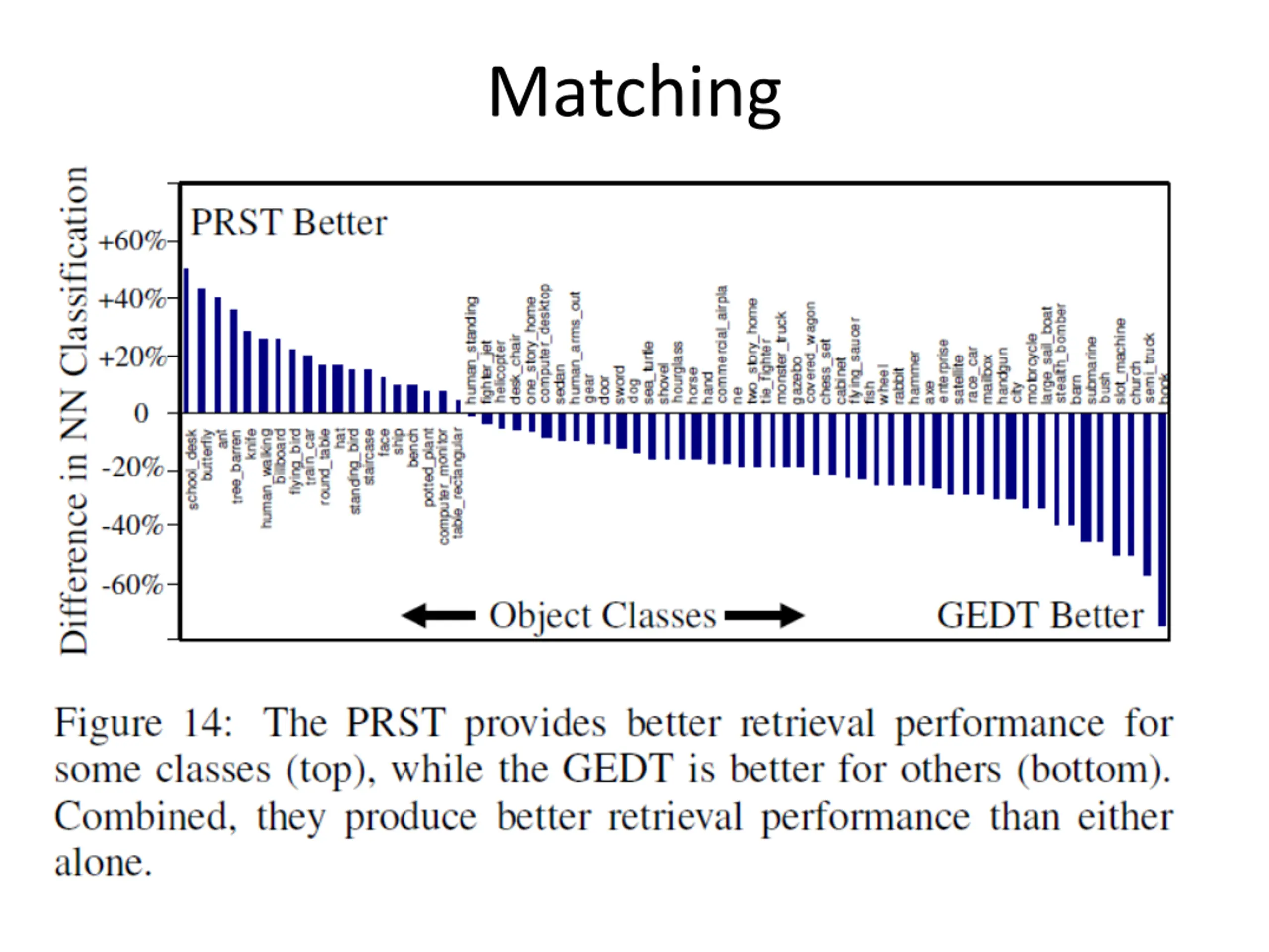 Matching Representation of shape: shape descriptor For recognition or classification Dissimilarity between a pair of aligned meshes: L2 distance between their discrete PSRT Weighting corresponding bins by sqrt(sin ) to account for different bin sizes ( polar angle of plane)