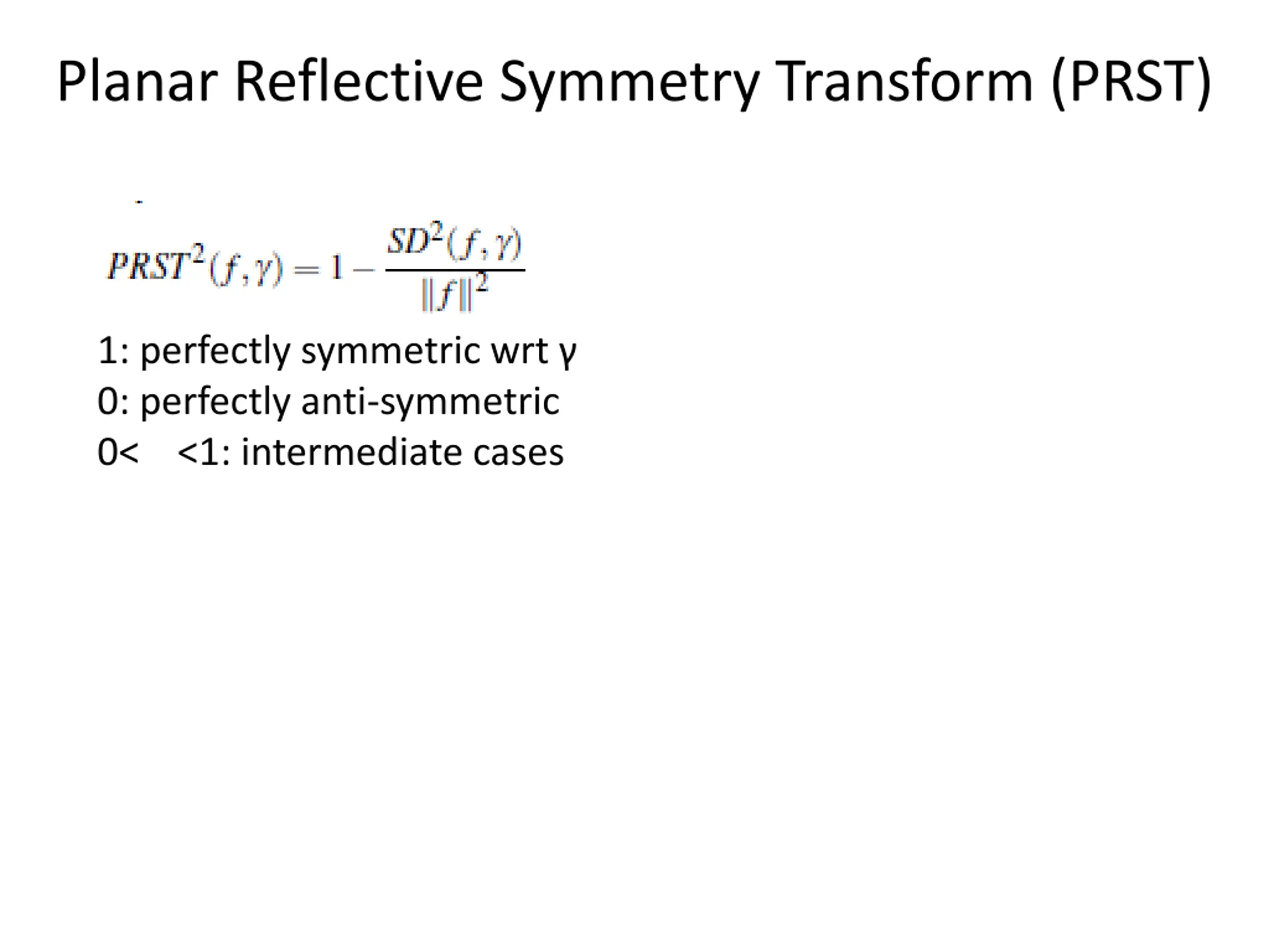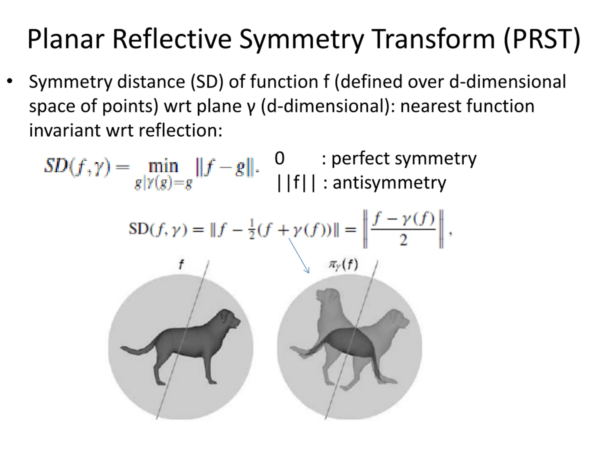 Planar Reflective Symmetry Transform (PRST) Symmetry distance (SD) of function f (defined over d-dimensional space of points) wrt plane (d-dimensional): nearest function invariant wrt reflection: 0 : perfect symmetry ||f|| : antisymmetry