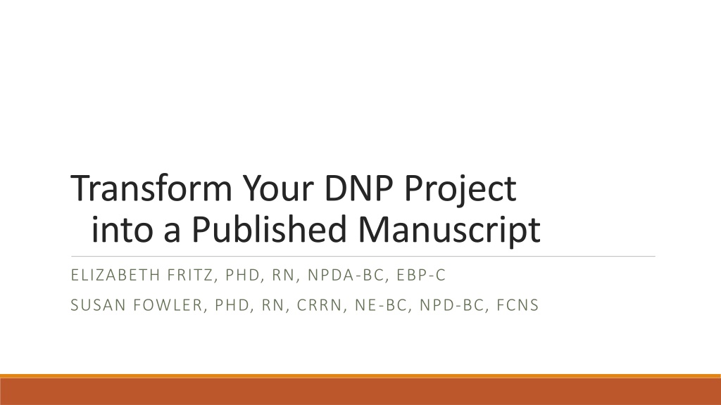 Transform Your DNP Project into a Published Manuscript ELIZABETH FRITZ, PHD, RN, NPDA-BC, EBP-C SUSAN FOWLER, PHD, RN, CRRN, NE-BC, NPD-BC, FCNS