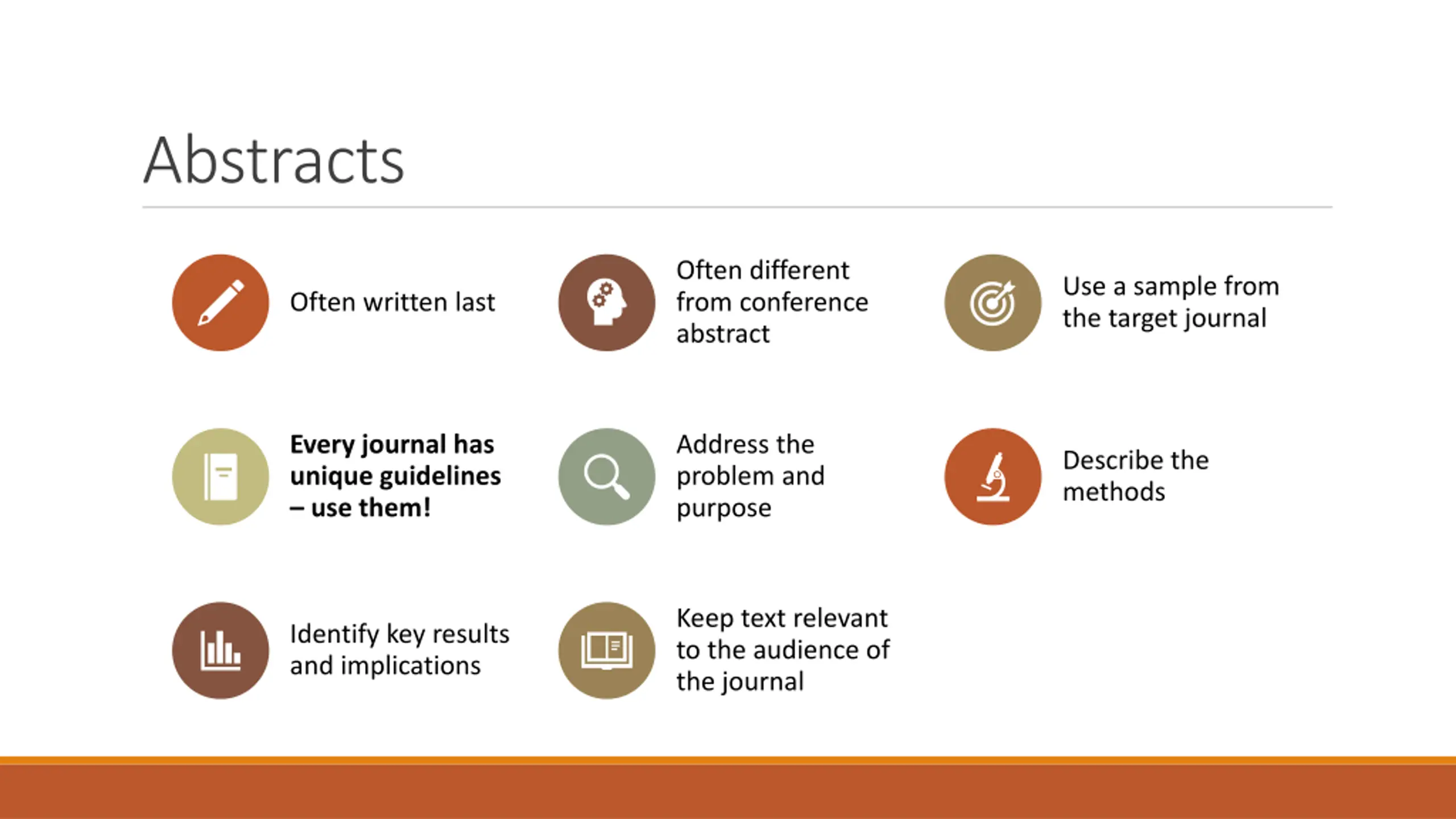 Abstracts Often different from conference abstract Use a sample from the target journal Often written last Every journal has unique guidelines use them! Address the problem and purpose Describe the methods Keep text relevant to the audience of the journal Identify key results and implications