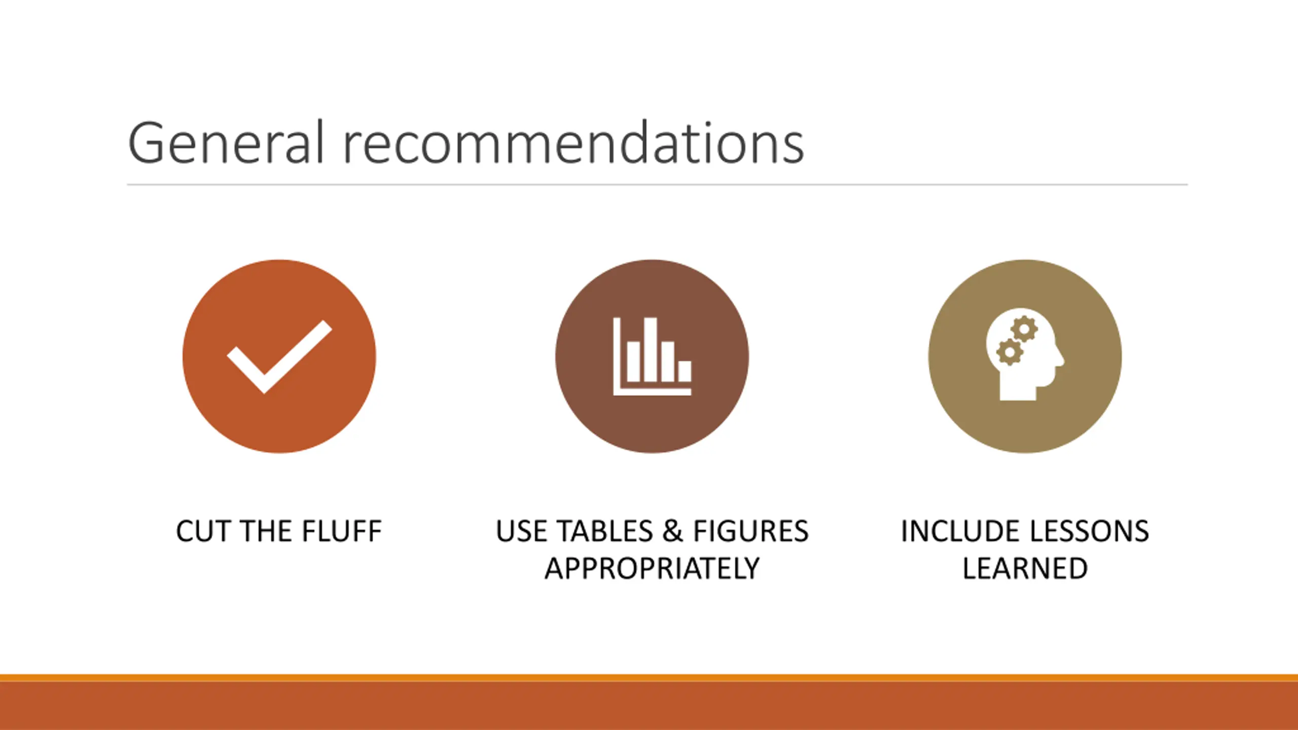 General recommendations CUT THE FLUFF USE TABLES & FIGURES APPROPRIATELY INCLUDE LESSONS LEARNED