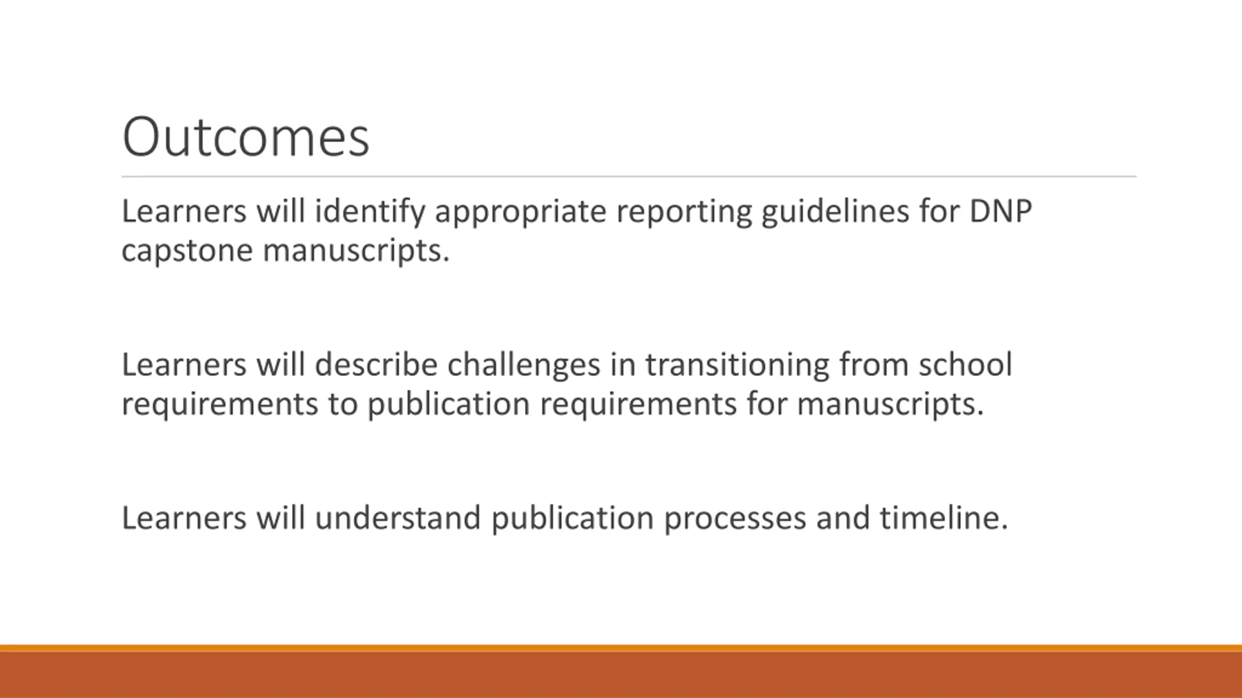 Outcomes Learners will identify appropriate reporting guidelines for DNP capstone manuscripts. Learners will describe challenges in transitioning from school requirements to publication requirements for manuscripts. Learners will understand publication processes and timeline.