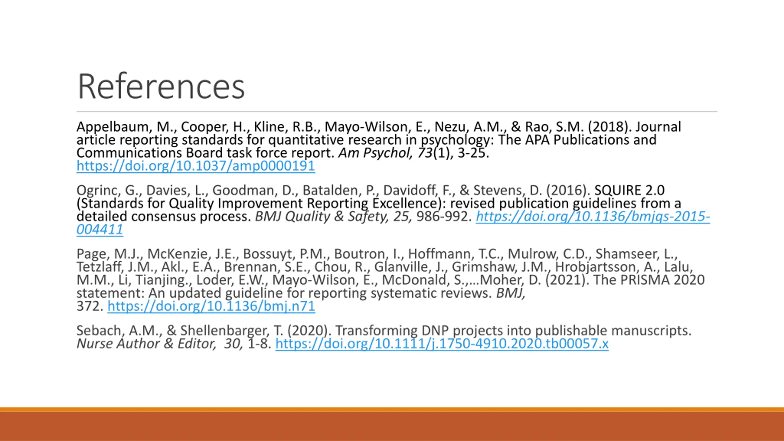 References Appelbaum, M., Cooper, H., Kline, R.B., Mayo-Wilson, E., Nezu, A.M., & Rao, S.M. (2018). Journal article reporting standards for quantitative research in psychology: The APA Publications and Communications Board task force report. Am Psychol, 73(1), 3-25. https://doi.org/10.1037/amp0000191 Ogrinc, G., Davies, L., Goodman, D., Batalden, P., Davidoff, F., & Stevens, D. (2016). SQUIRE 2.0 (Standards for Quality Improvement Reporting Excellence): revised publication guidelines from a detailed consensus process. BMJ Quality & Safety, 25, 986-992. https://doi.org/10.1136/bmjqs-2015- 004411 Page, M.J., McKenzie, J.E., Bossuyt, P.M., Boutron, I., Hoffmann, T.C., Mulrow, C.D., Shamseer, L., Tetzlaff, J.M., Akl., E.A., Brennan, S.E., Chou, R., Glanville, J., Grimshaw, J.M., Hrobjartsson, A., Lalu, M.M., Li, Tianjing., Loder, E.W., Mayo-Wilson, E., McDonald, S., Moher, D. (2021). The PRISMA 2020 statement: An updated guideline for reporting systematic reviews. BMJ, 372. https://doi.org/10.1136/bmj.n71 Sebach, A.M., & Shellenbarger, T. (2020). Transforming DNP projects into publishable manuscripts. Nurse Author & Editor, 30, 1-8. https://doi.org/10.1111/j.1750-4910.2020.tb00057.x