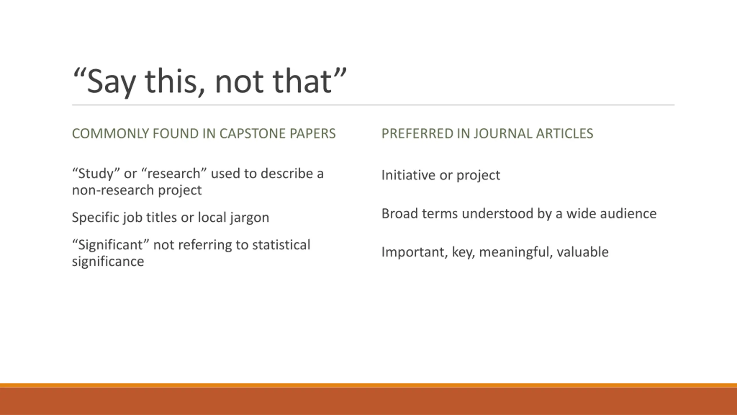 Say this, not that COMMONLY FOUND IN CAPSTONE PAPERS PREFERRED IN JOURNAL ARTICLES Study or research used to describe a non-research project Initiative or project Broad terms understood by a wide audience Specific job titles or local jargon Significant not referring to statistical significance Important, key, meaningful, valuable