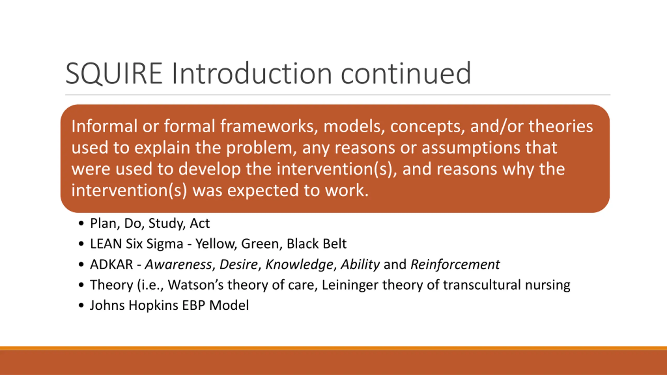 SQUIRE Introduction continued Informal or formal frameworks, models, concepts, and/or theories used to explain the problem, any reasons or assumptions that were used to develop the intervention(s), and reasons why the intervention(s) was expected to work. Plan, Do, Study, Act LEAN Six Sigma - Yellow, Green, Black Belt ADKAR - Awareness, Desire, Knowledge, Ability and Reinforcement Theory (i.e., Watson s theory of care, Leininger theory of transcultural nursing Johns Hopkins EBP Model