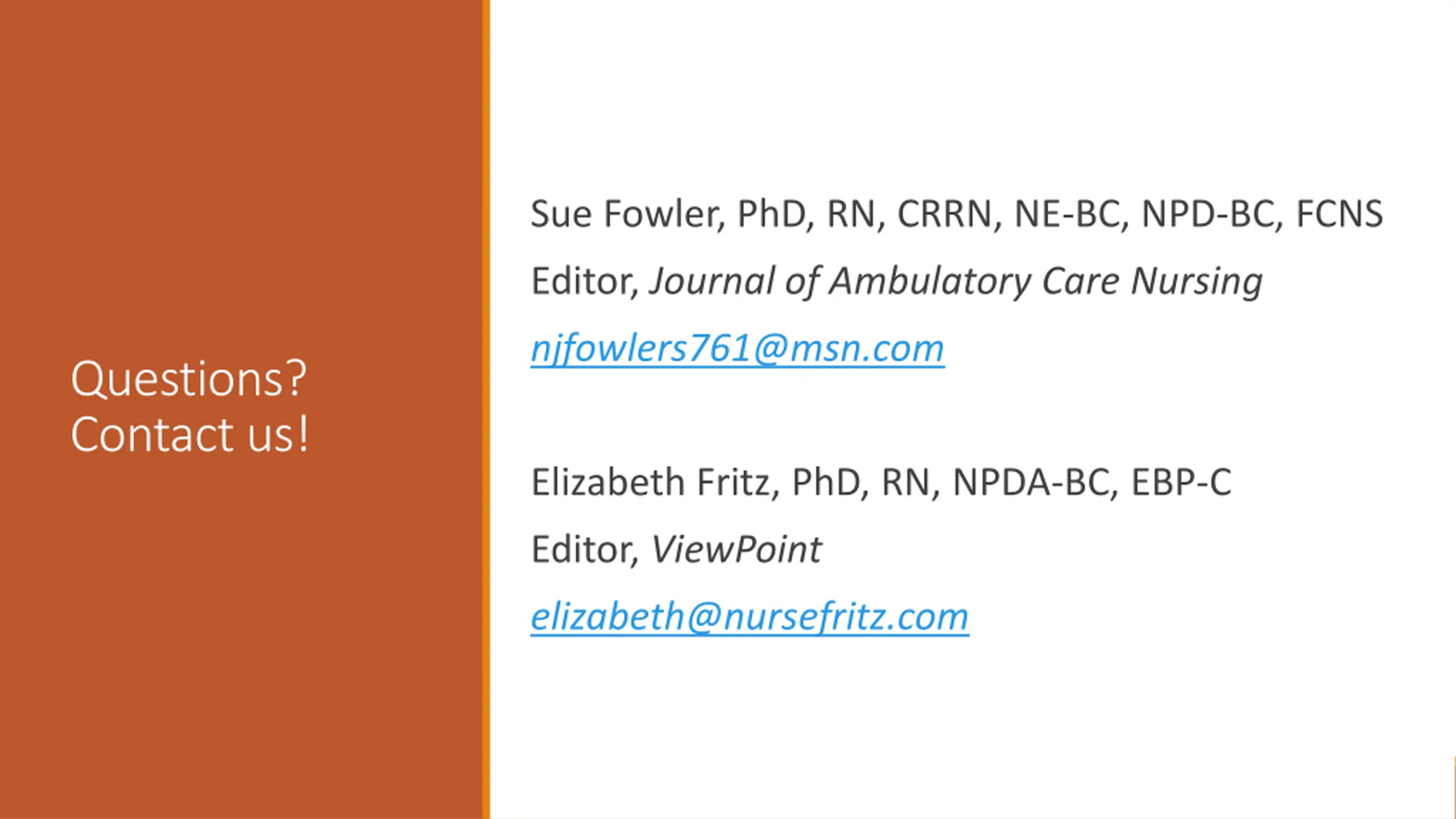 Sue Fowler, PhD, RN, CRRN, NE-BC, NPD-BC, FCNS Editor, Journal of Ambulatory Care Nursing njfowlers761@msn.com Questions? Contact us! Elizabeth Fritz, PhD, RN, NPDA-BC, EBP-C Editor, ViewPoint elizabeth@nursefritz.com