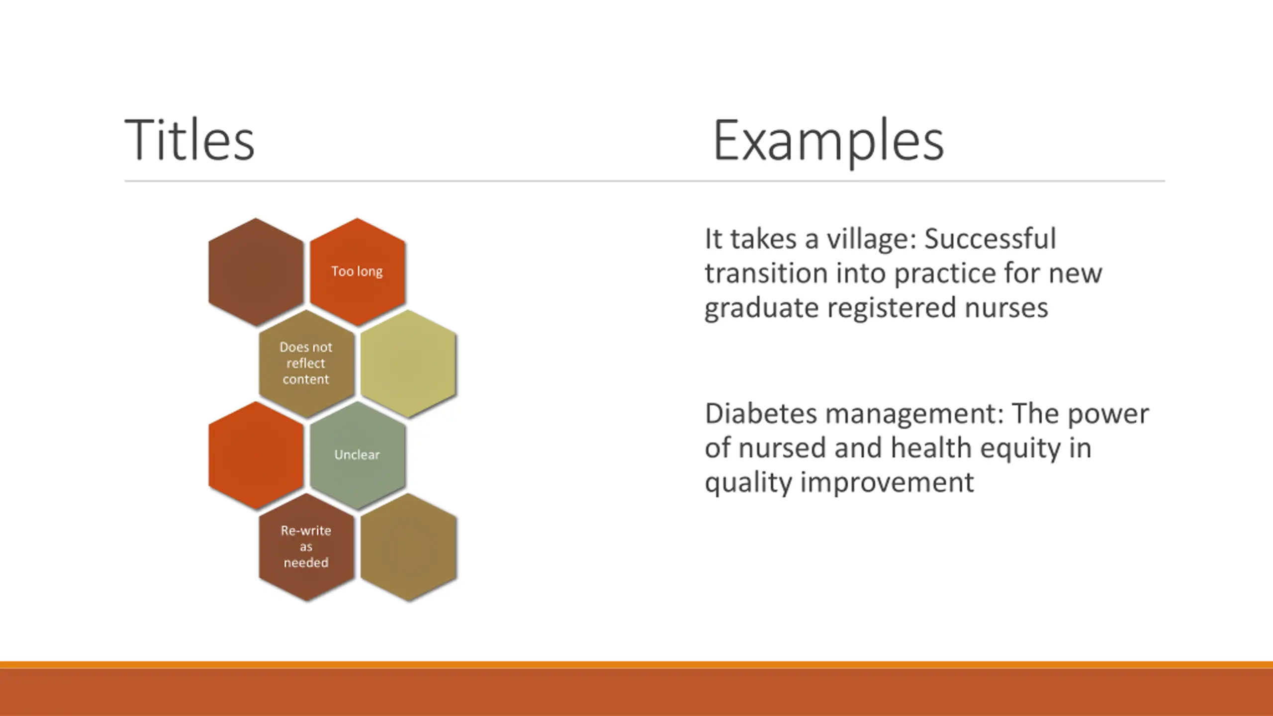Titles Examples It takes a village: Successful transition into practice for new graduate registered nurses Too long Does not reflect content Diabetes management: The power of nursed and health equity in quality improvement Unclear Re-write as needed