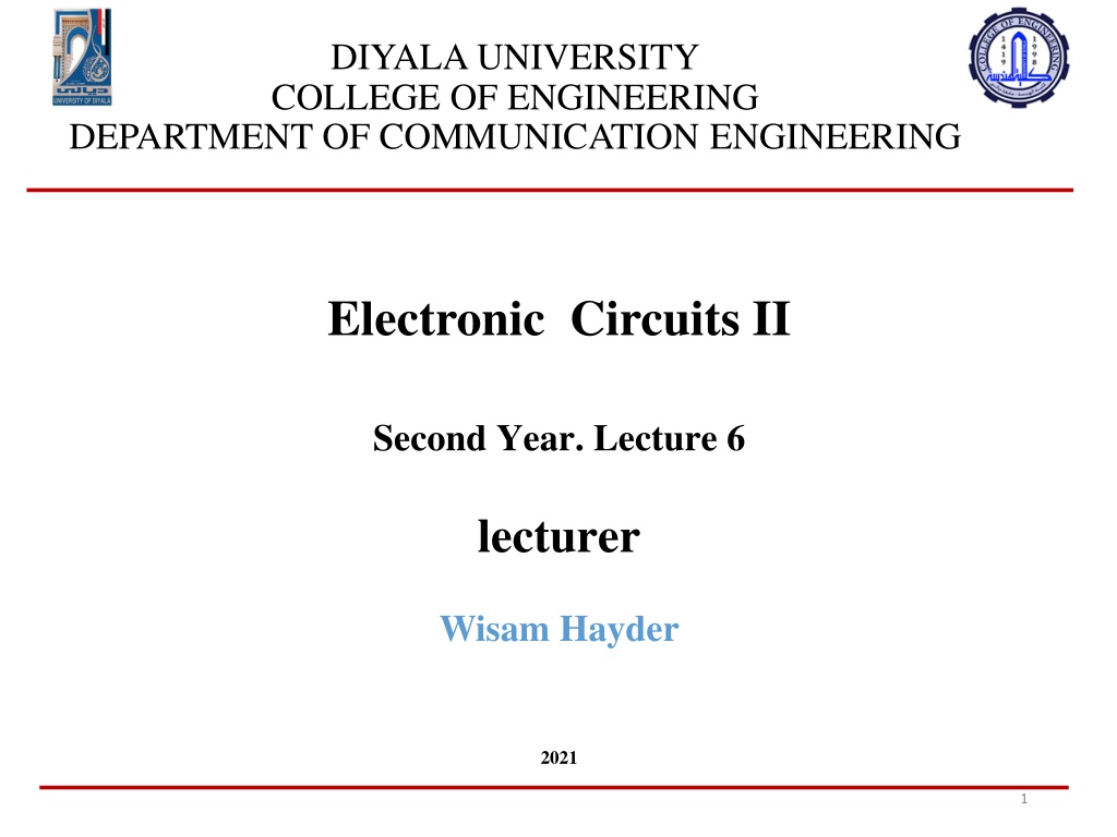 DIYALA UNIVERSITY COLLEGE OF ENGINEERING DEPARTMENT OF COMMUNICATION ENGINEERING Electronic Circuits II Second Year. Lecture 6 lecturer Wisam Hayder 2021 1