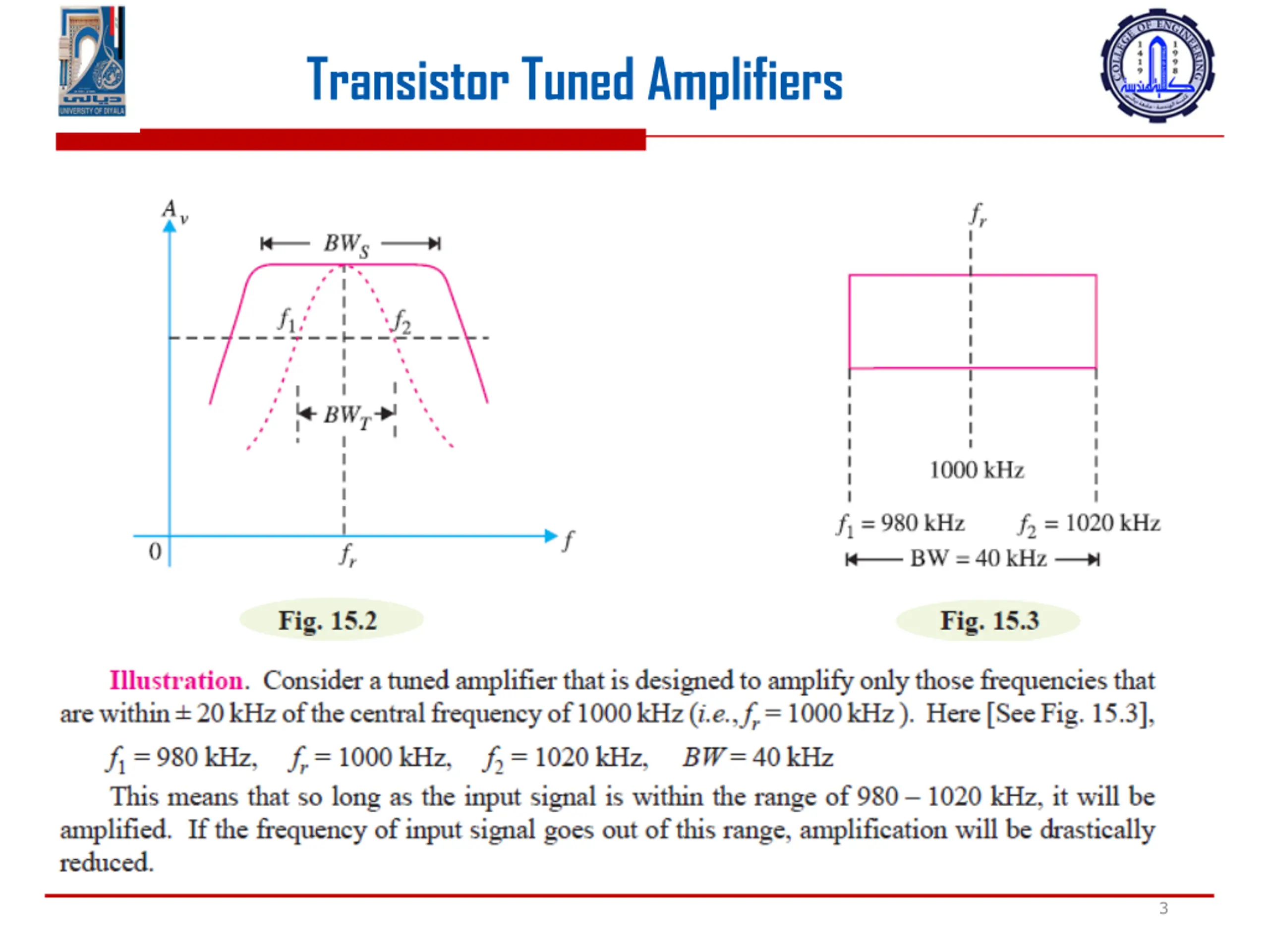 Transistor Tuned Amplifiers Distinction between Tuned Amplifiers and other Amplifiers We have seen that amplifiers (e.g., voltage amplifier, power amplifier etc.) provide the constant gain over a limited band of frequencies i.e., from lower cut-off frequency ?1to upper cut-off frequency ?2. Now bandwidth of the amplifier, BW = f2 f1. The difference, that tuned amplifiers are designed to have specific, usually narrow bandwidth. See Fig. 15.2. Note that ???is the bandwidth of standard frequency response while ???is the bandwidth of the tuned amplifier. In many applications, the narrower the bandwidth of a tuned amplifier, the better it is. 2