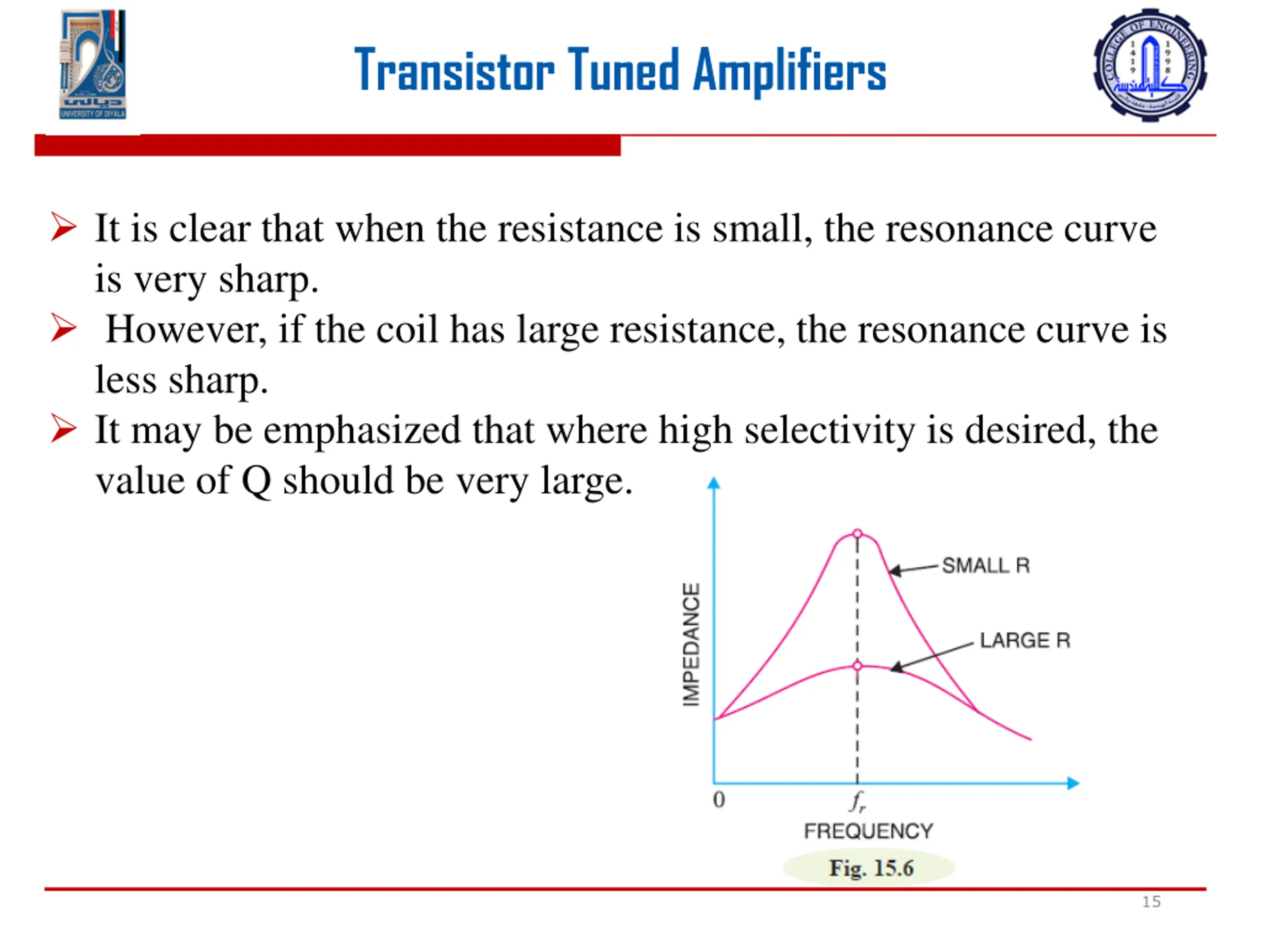 Transistor Tuned Amplifiers It is clear that when the resistance is small, the resonance curve is very sharp. However, if the coil has large resistance, the resonance curve is less sharp. It may be emphasized that where high selectivity is desired, the value of Q should be very large. 15