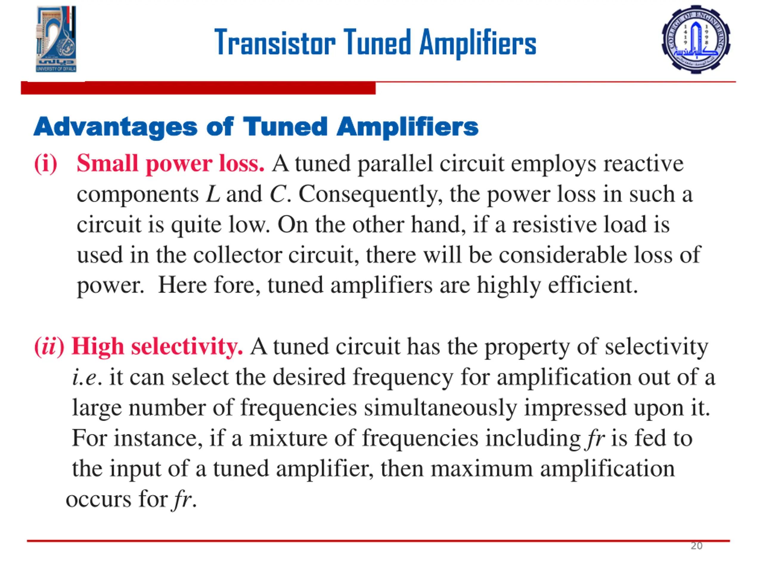 Transistor Tuned Amplifiers Advantages Advantages of Tuned Amplifiers of Tuned Amplifiers (i) Small power loss. A tuned parallel circuit employs reactive components L and C. Consequently, the power loss in such a circuit is quite low. On the other hand, if a resistive load is used in the collector circuit, there will be considerable loss of power. Here fore, tuned amplifiers are highly efficient. (ii) High selectivity. A tuned circuit has the property of selectivity i.e. it can select the desired frequency for amplification out of a large number of frequencies simultaneously impressed upon it. For instance, if a mixture of frequencies including fr is fed to the input of a tuned amplifier, then maximum amplification occurs for fr. 20 20