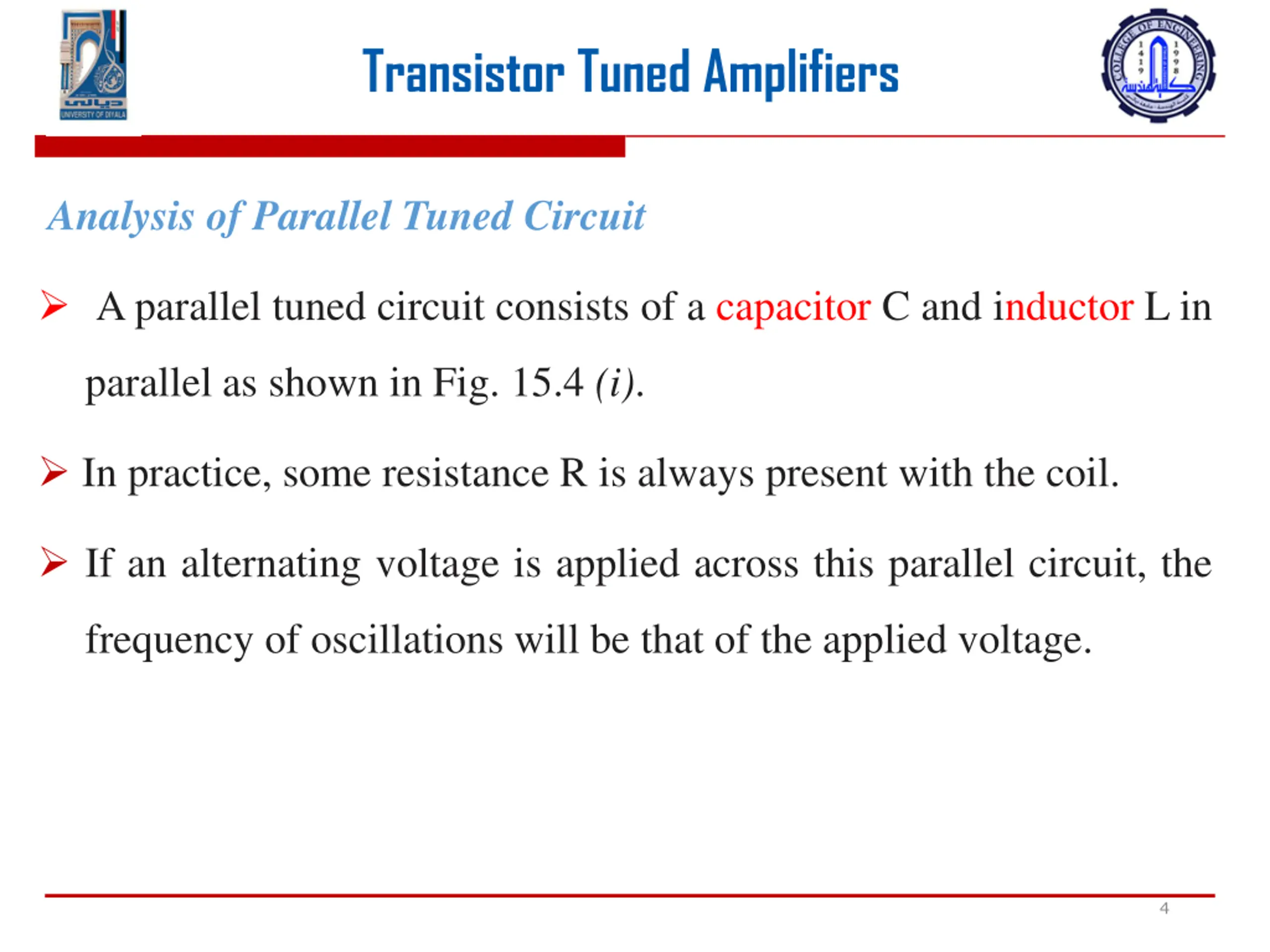 Transistor Tuned Amplifiers Analysis of Parallel Tuned Circuit Aparallel tuned circuit consists of a capacitor C and inductor L in parallel as shown in Fig. 15.4 (i). In practice, some resistance R is always present with the coil. If an alternating voltage is applied across this parallel circuit, the frequency of oscillations will be that of the applied voltage. 4