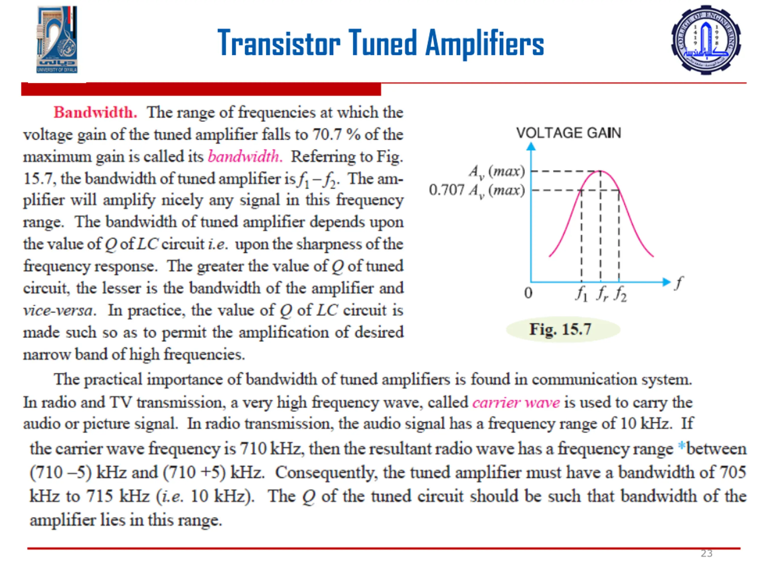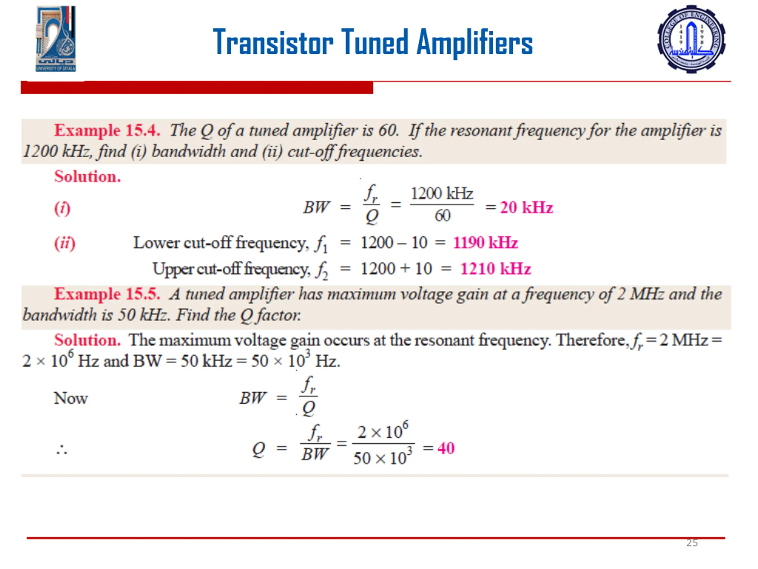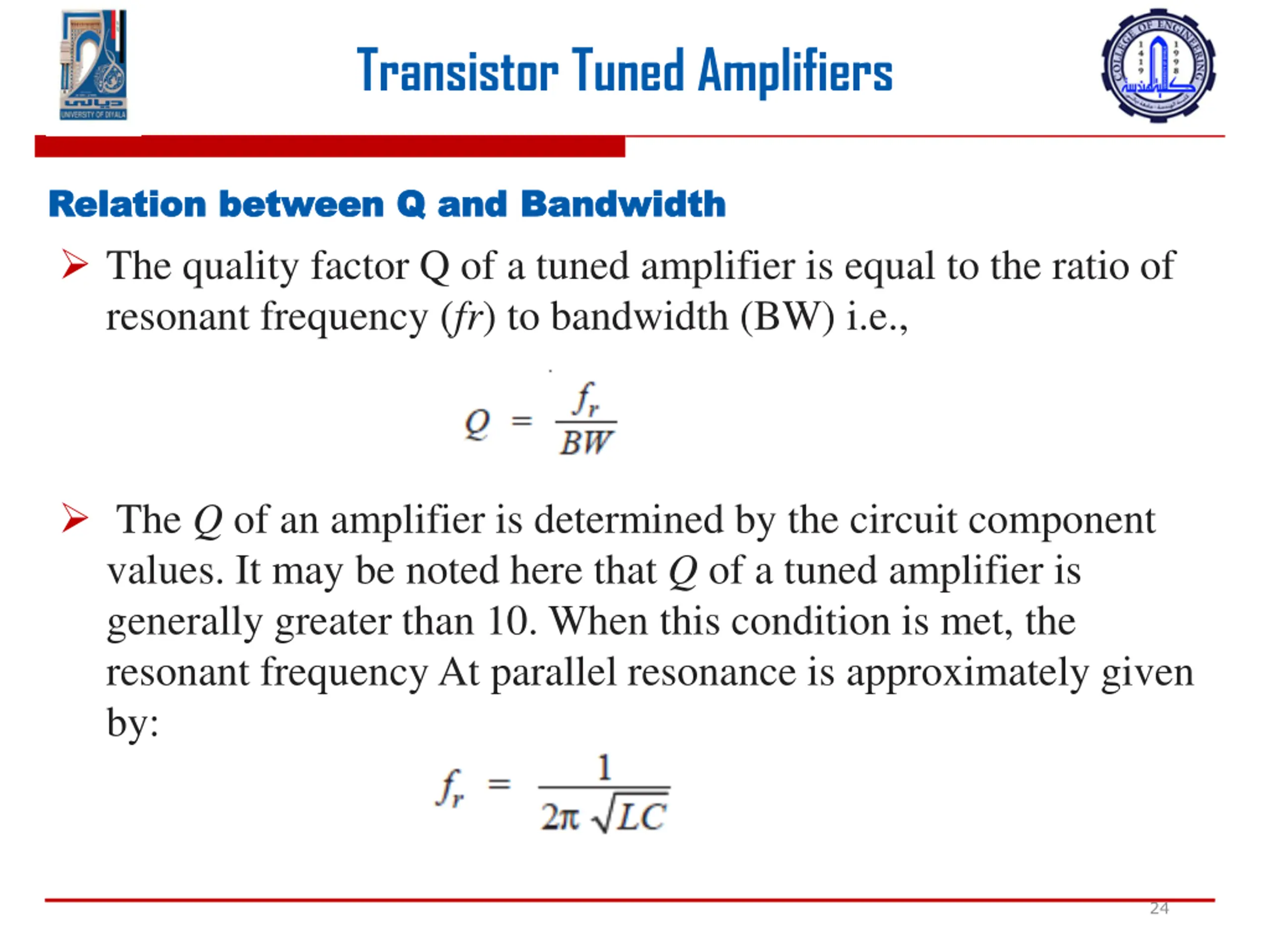 Transistor Tuned Amplifiers Relation between Q and Bandwidth Relation between Q and Bandwidth The quality factor Q of a tuned amplifier is equal to the ratio of resonant frequency (fr) to bandwidth (BW) i.e., The Q of an amplifier is determined by the circuit component values. It may be noted here that Q of a tuned amplifier is generally greater than 10. When this condition is met, the resonant frequency At parallel resonance is approximately given by: 24