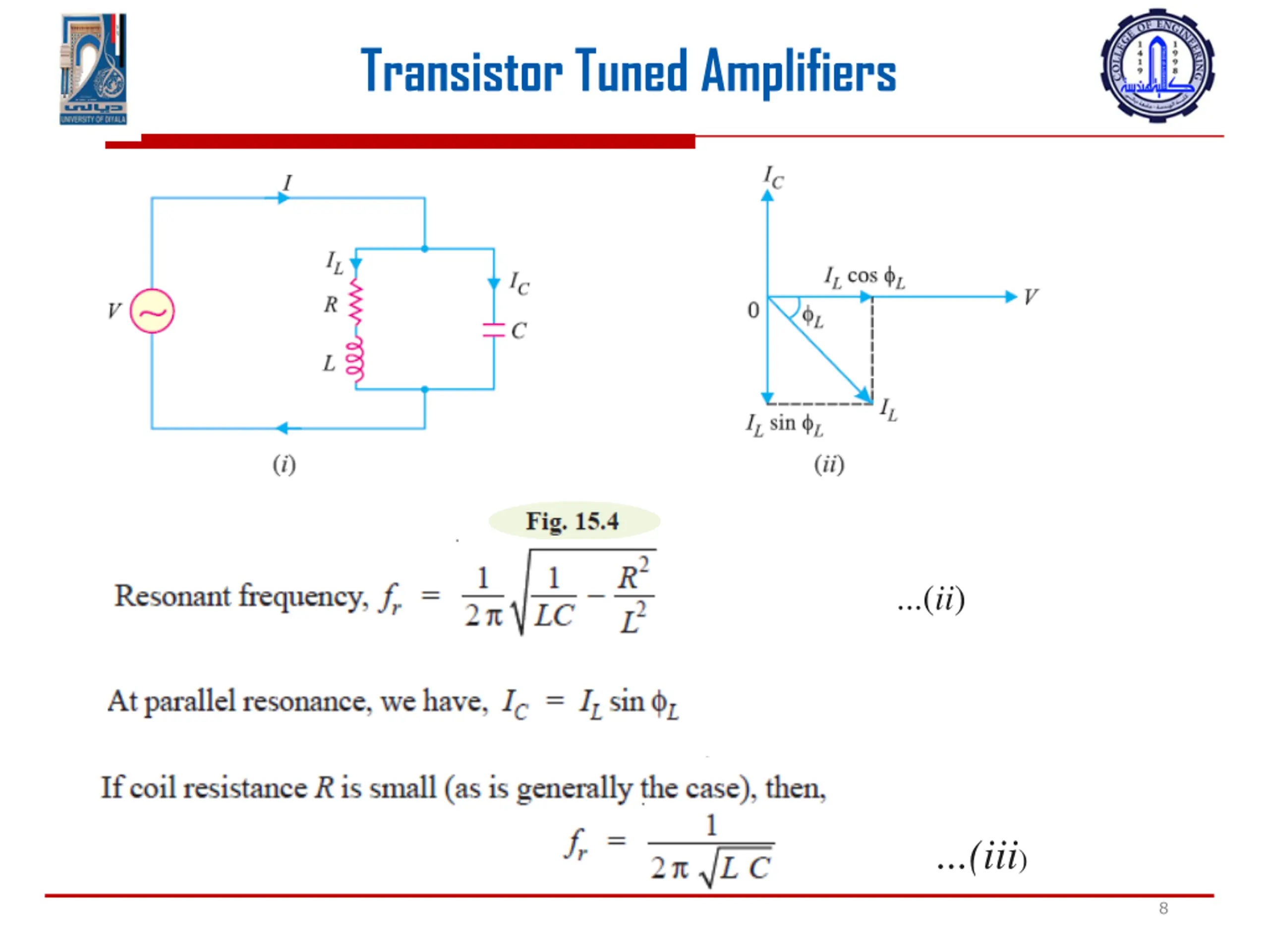 Transistor Tuned Amplifiers Parallel resonance A parallel circuit containing reactive elements (L and C ) is resonant when the circuit power factor is unity i.e. applied voltage and the supply current are in phase. The phasor diagram of the parallel circuit is shown in Fig. 15. 4 (ii). The coil current ??has two rectangular components viz active component ????? ?and reactive component ????? ?. 6