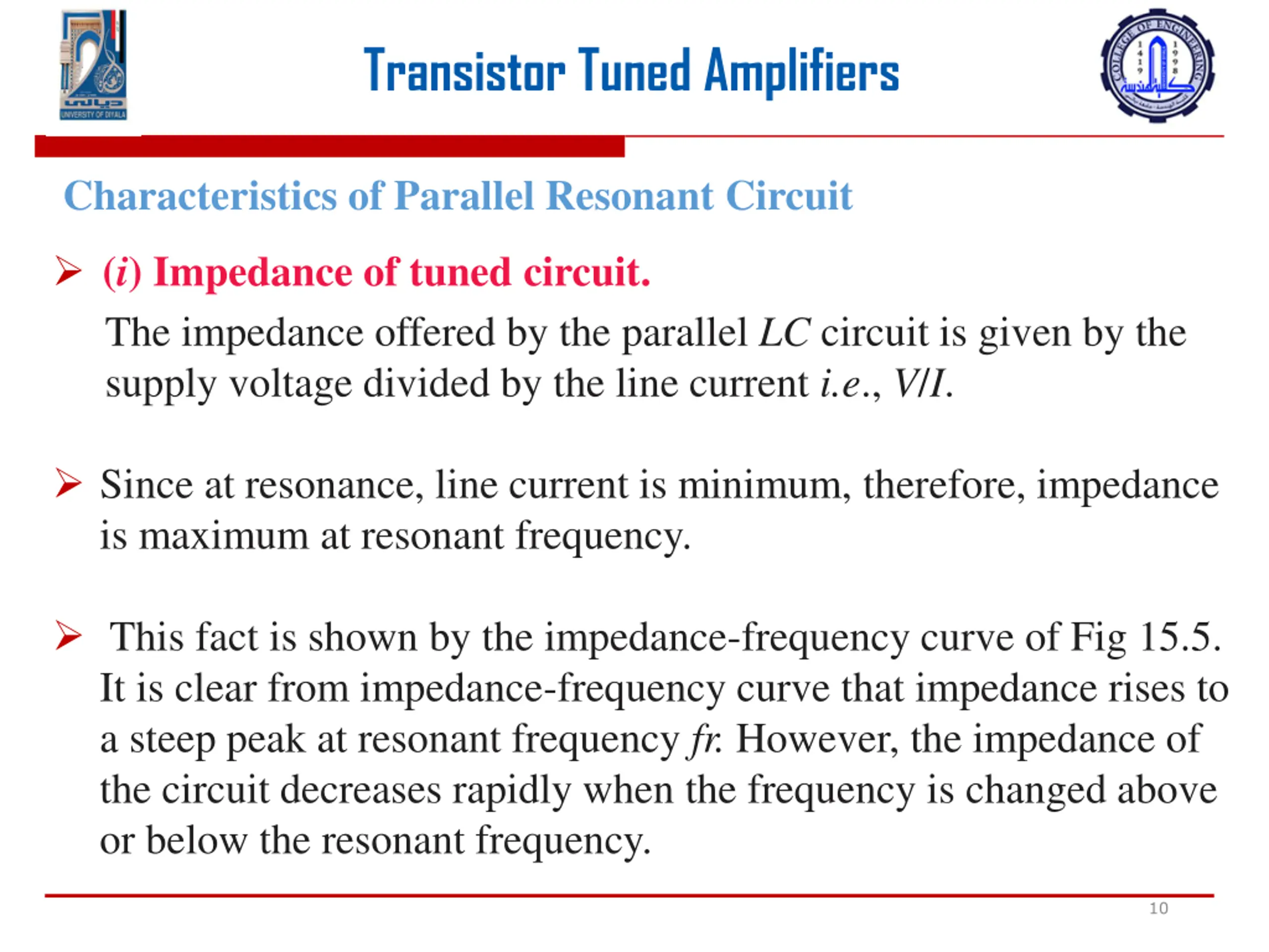 Transistor Tuned Amplifiers Characteristics of Parallel Resonant Circuit (i) Impedance of tuned circuit. The impedance offered by the parallel LC circuit is given by the supply voltage divided by the line current i.e., V/I. Since at resonance, line current is minimum, therefore, impedance is maximum at resonant frequency. This fact is shown by the impedance-frequency curve of Fig 15.5. It is clear from impedance-frequency curve that impedance rises to a steep peak at resonant frequency fr. However, the impedance of the circuit decreases rapidly when the frequency is changed above or below the resonant frequency. 10