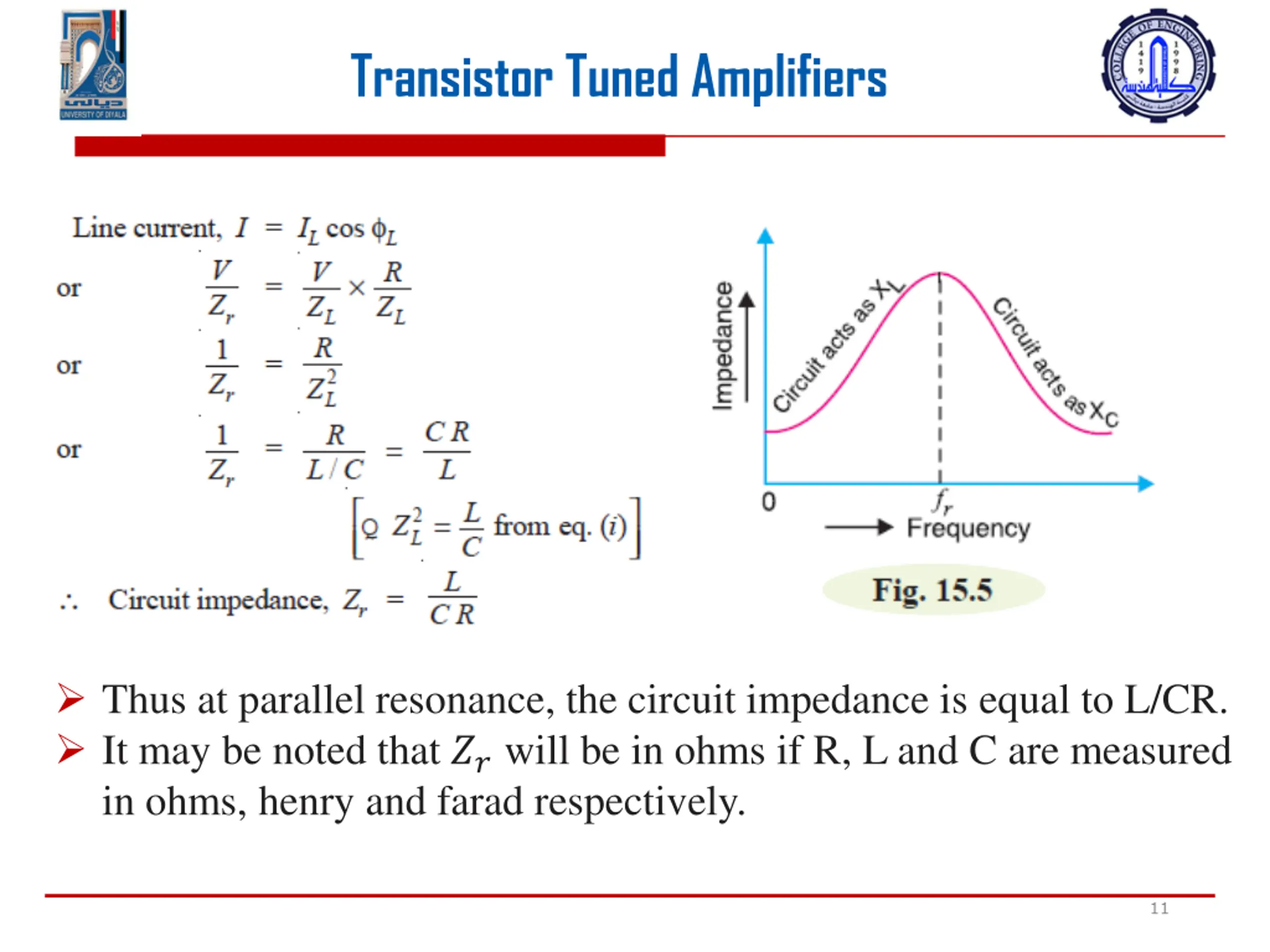 Transistor Tuned Amplifiers Thus at parallel resonance, the circuit impedance is equal to L/CR. It may be noted that ??will be in ohms if R, L and C are measured in ohms, henry and farad respectively. 11