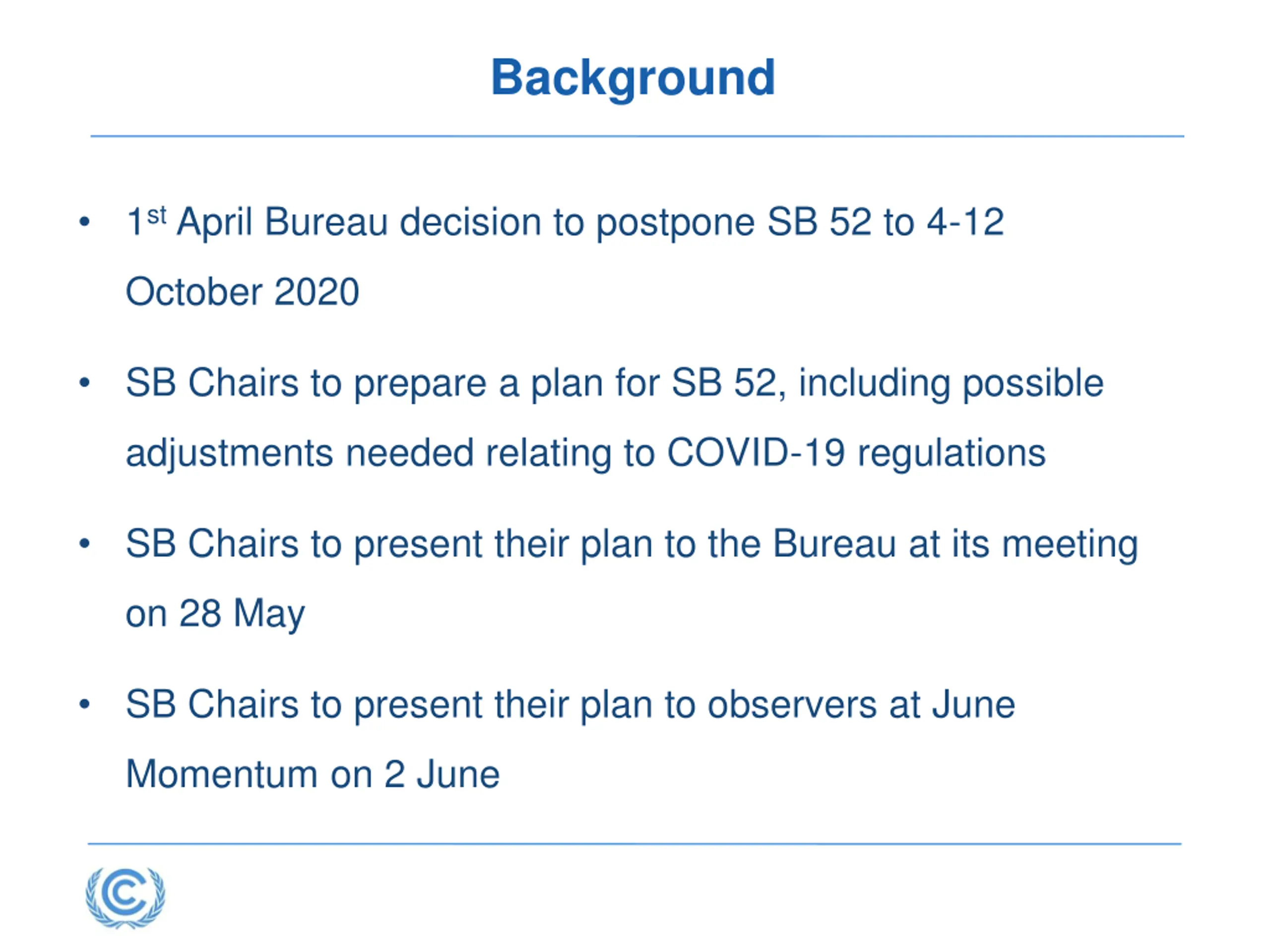 Background 1st April Bureau decision to postpone SB 52 to 4-12 October 2020 SB Chairs to prepare a plan for SB 52, including possible adjustments needed relating to COVID-19 regulations SB Chairs to present their plan to the Bureau at its meeting on 28 May SB Chairs to present their plan to observers at June Momentum on 2 June