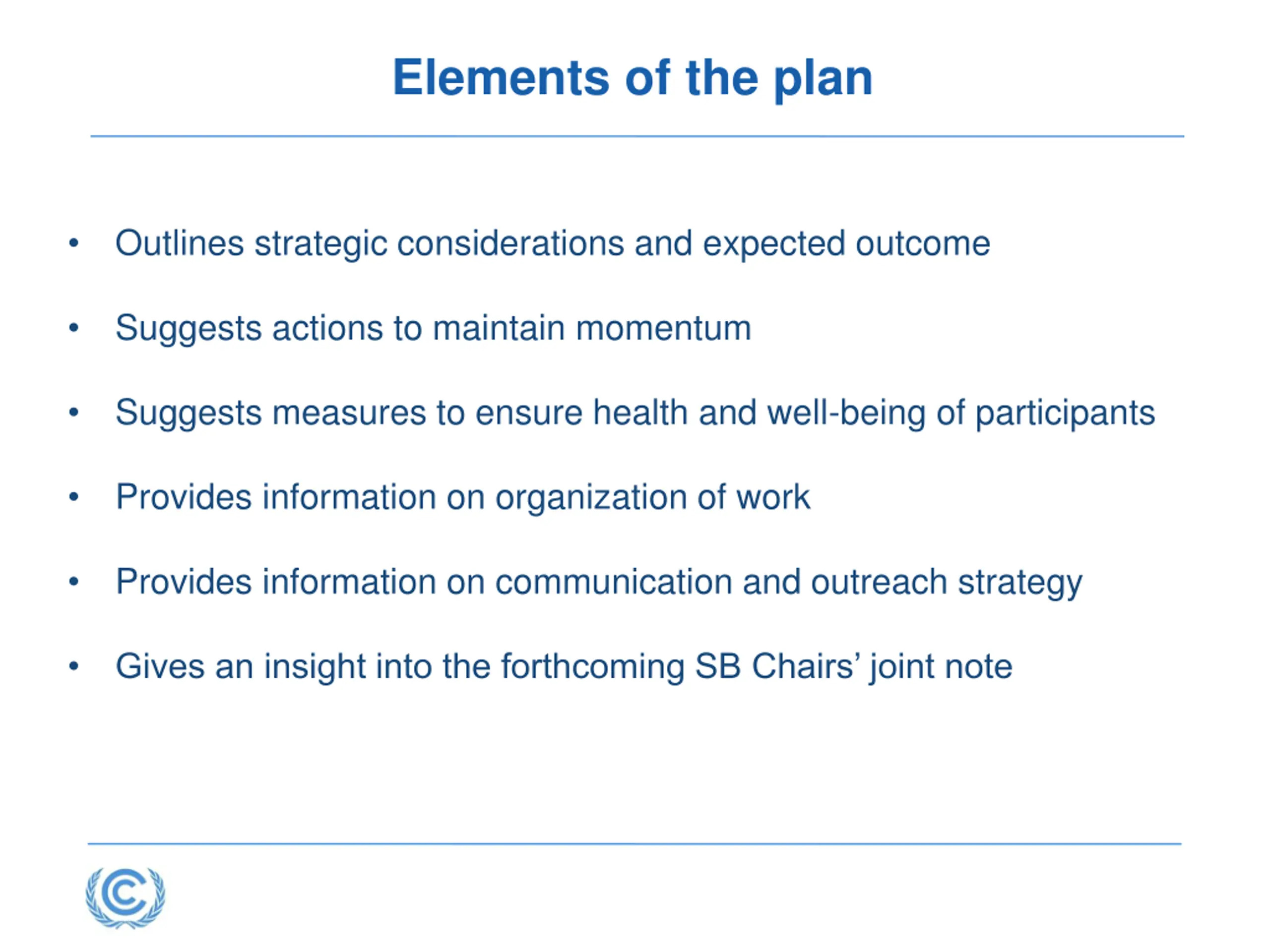 Elements of the plan Outlines strategic considerations and expected outcome Suggests actions to maintain momentum Suggests measures to ensure health and well-being of participants Provides information on organization of work Provides information on communication and outreach strategy Gives an insight into the forthcoming SB Chairs joint note