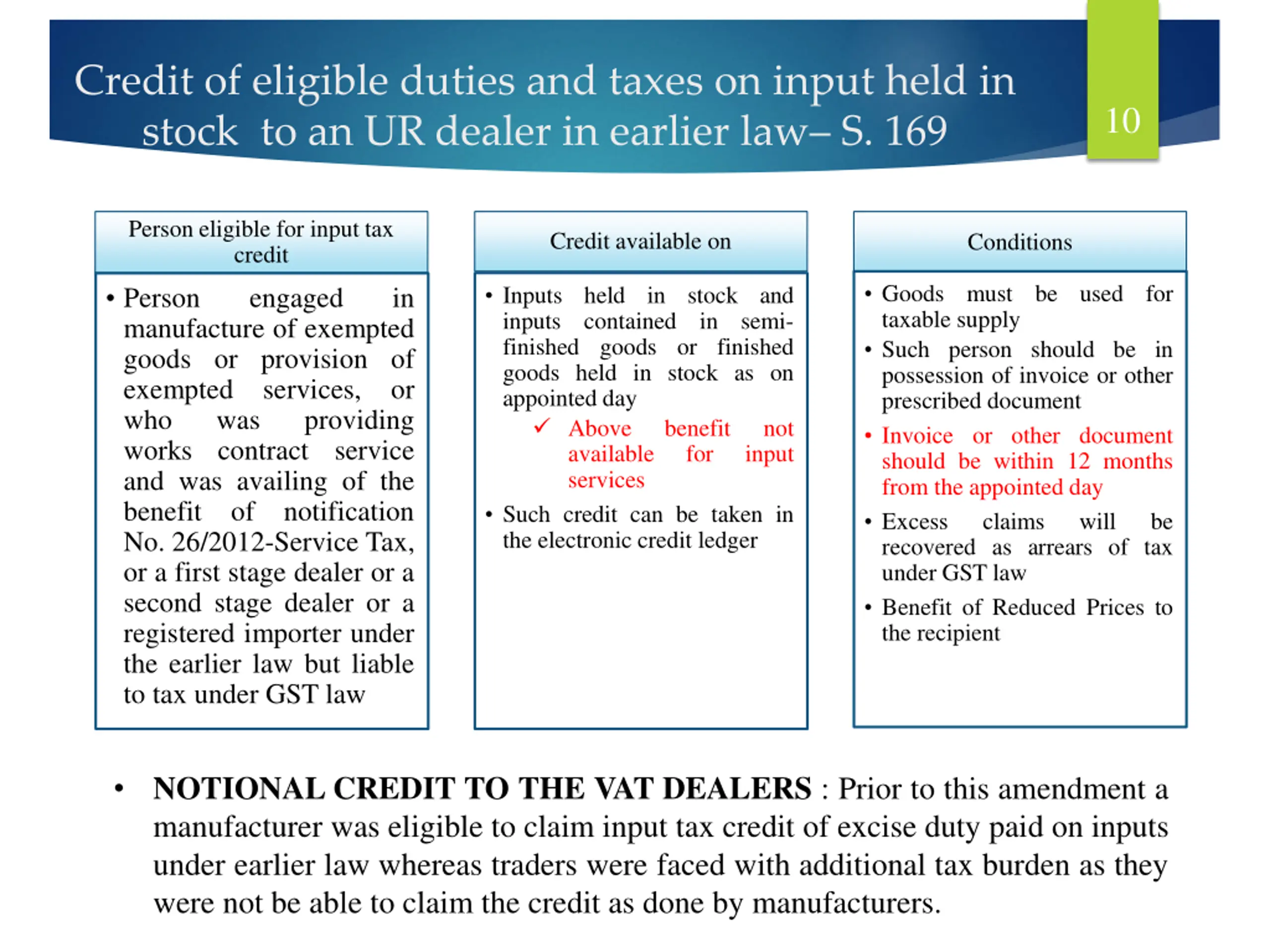 Credit of eligible duties and taxes on input held in stock to an UR dealer in earlier law S. 169 10 Person eligible for input tax credit Person engaged manufacture of exempted goods or provision of exempted services, or who was works contract service and was availing of the benefit of notification No. 26/2012-Service Tax, or a first stage dealer or a second stage dealer or a registered importer under the earlier law but liable to tax under GST law Credit available on Conditions Goods must be used for taxable supply Such person should be in possession of invoice or other prescribed document Invoice or other document should be within 12 months from the appointed day Excess claims recovered as arrears of tax under GST law Benefit of Reduced Prices to the recipient Inputs held in stock and inputs contained in semi- finished goods or finished goods held in stock as on appointed day Above available services Such credit can be taken in the electronic credit ledger in providing benefit for not input will be NOTIONAL CREDIT TO THE VAT DEALERS : Prior to this amendment a manufacturer was eligible to claim input tax credit of excise duty paid on inputs under earlier law whereas traders were faced with additional tax burden as they were not be able to claim the credit as done by manufacturers.