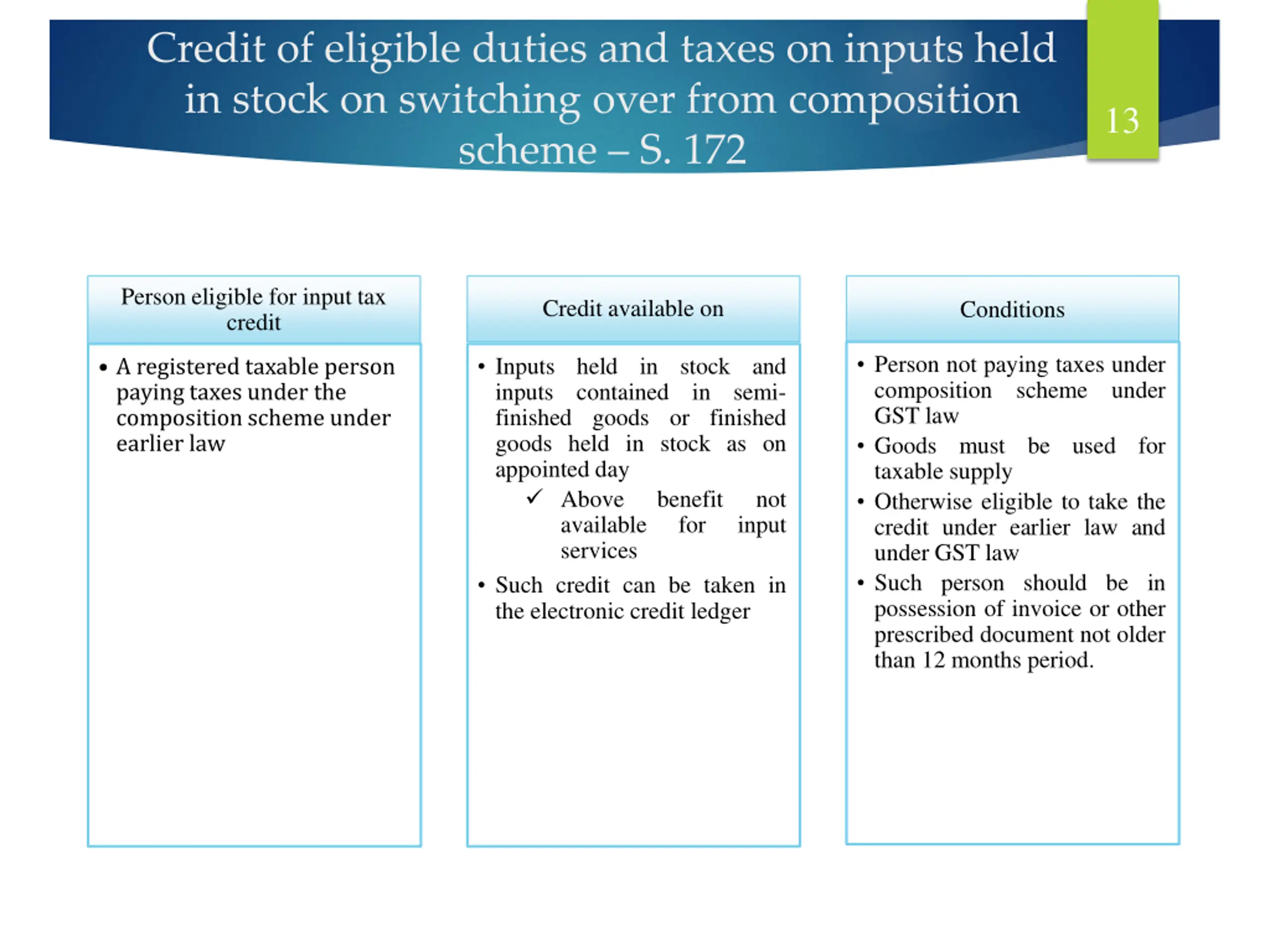 Credit of eligible duties and taxes on inputs held in stock on switching over from composition scheme S. 172 13 Person eligible for input tax credit Credit available on Conditions Person not paying taxes under composition scheme under GST law Goods must be used for taxable supply Otherwise eligible to take the credit under earlier law and under GST law Such person should be in possession of invoice or other prescribed document not older than 12 months period. Inputs held in stock and inputs contained in semi- finished goods or finished goods held in stock as on appointed day Above available services Such credit can be taken in the electronic credit ledger A registered taxable person paying taxes under the composition scheme under earlier law benefit for not input