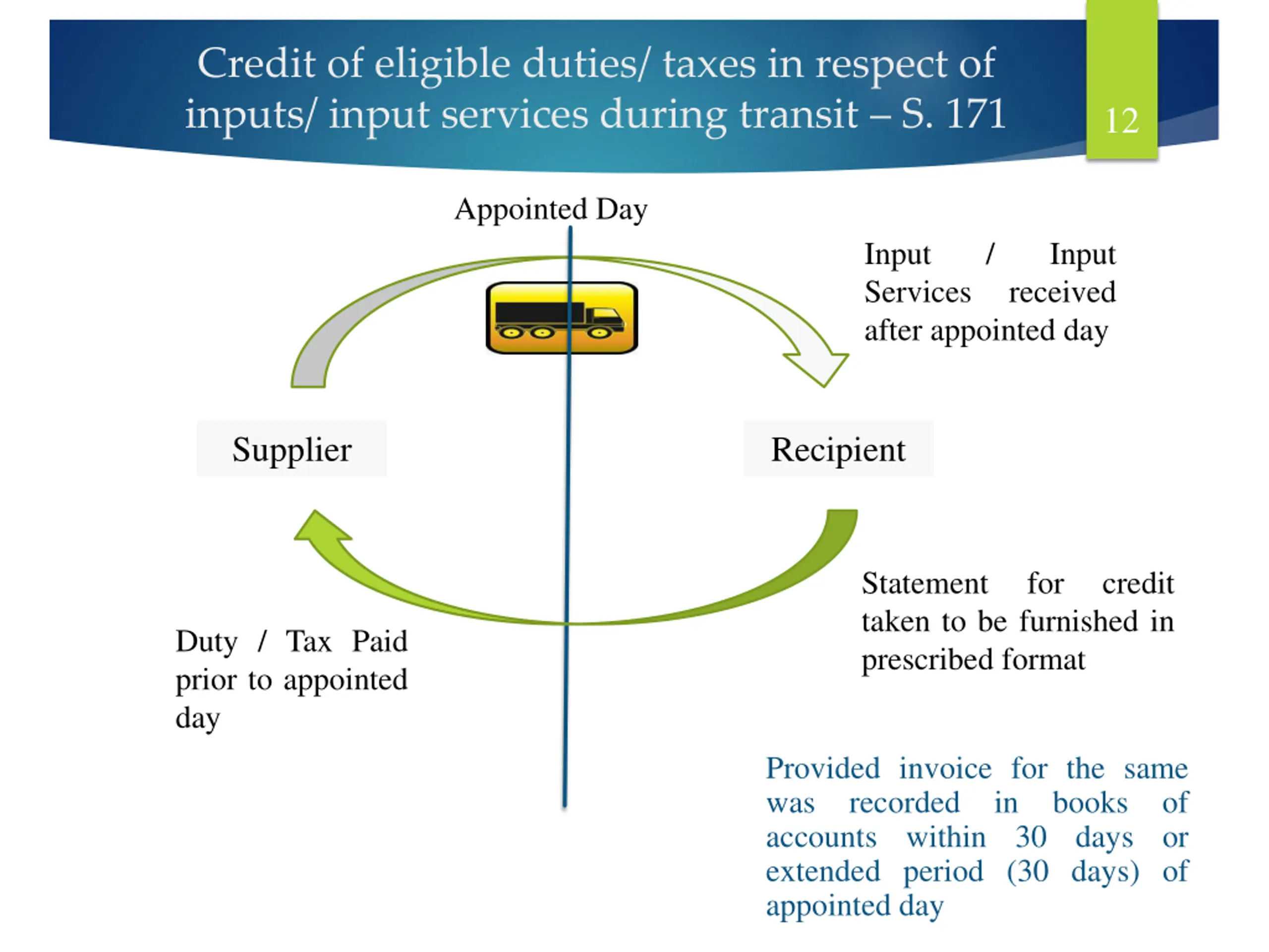Credit of eligible duties/ taxes in respect of inputs/ input services during transit S. 171 12 Appointed Day Input Services after appointed day / Input received Supplier Recipient Statement taken to be furnished in prescribed format for credit Duty / Tax Paid prior to appointed day Provided invoice for the same was recorded in books of accounts within 30 days or extended period (30 days) of appointed day