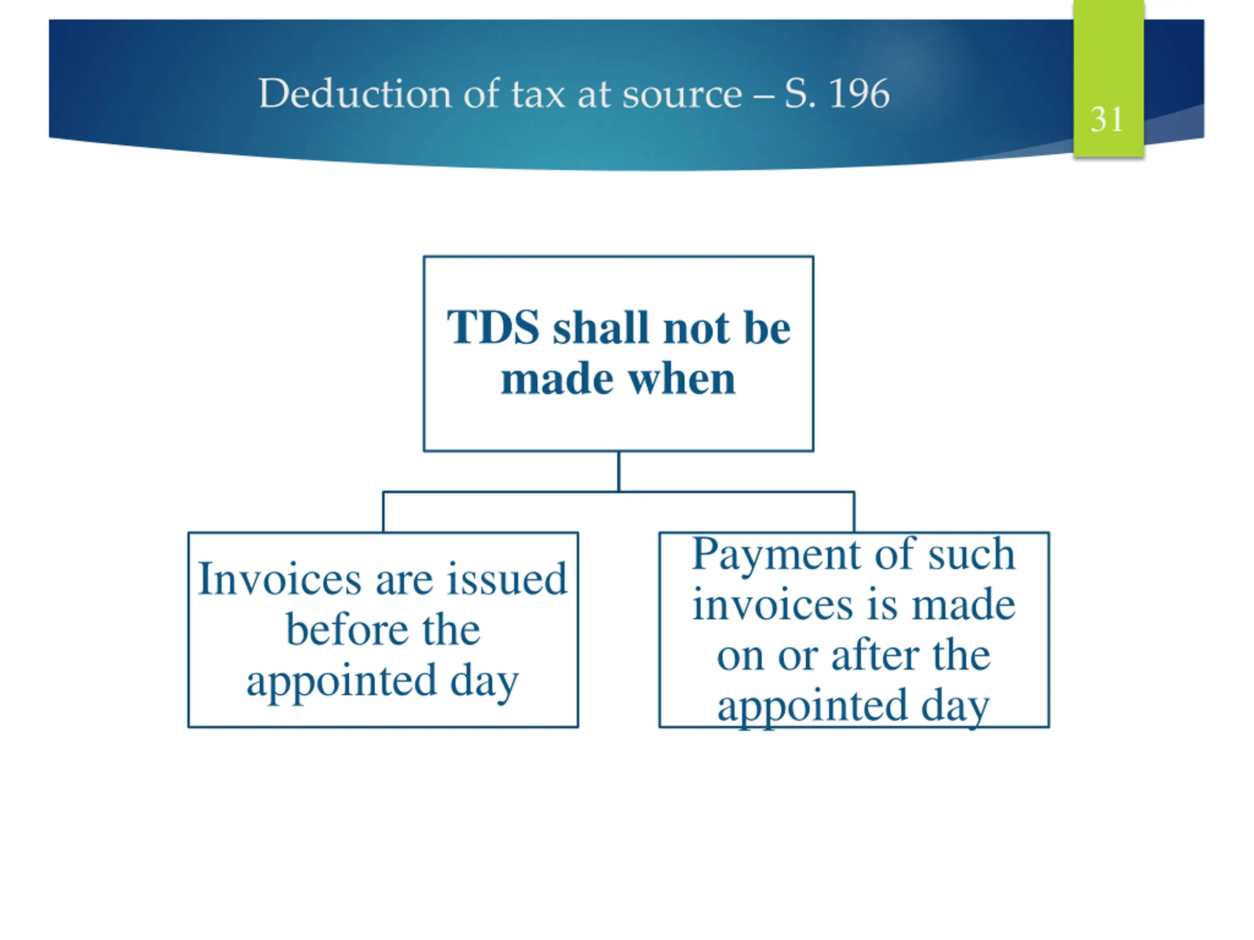 Deduction of tax at source S. 196 31 TDS shall not be made when Payment of such invoices is made on or after the appointed day Invoices are issued before the appointed day