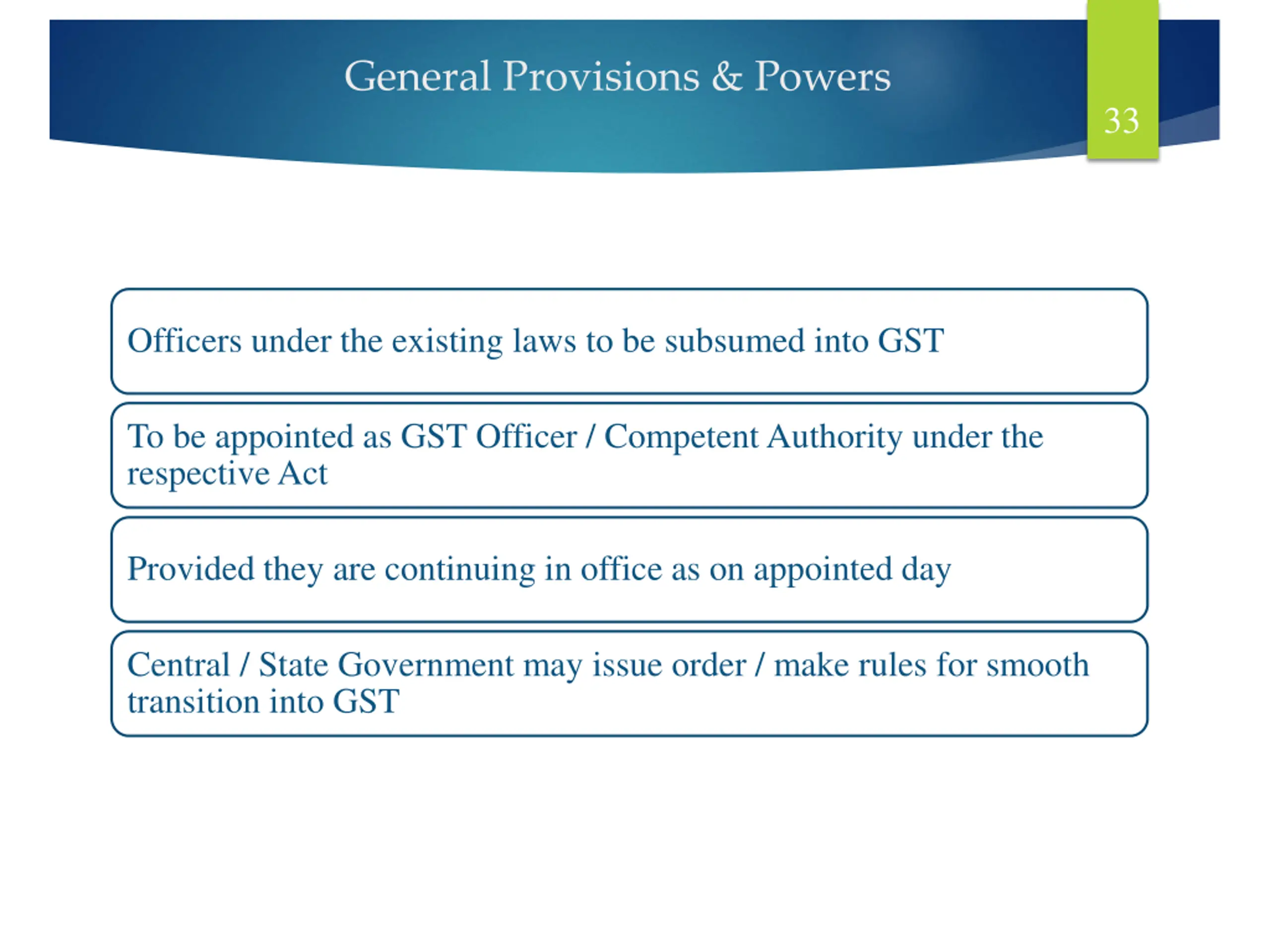 General Provisions & Powers 33 Officers under the existing laws to be subsumed into GST To be appointed as GST Officer / Competent Authority under the respective Act Provided they are continuing in office as on appointed day Central / State Government may issue order / make rules for smooth transition into GST