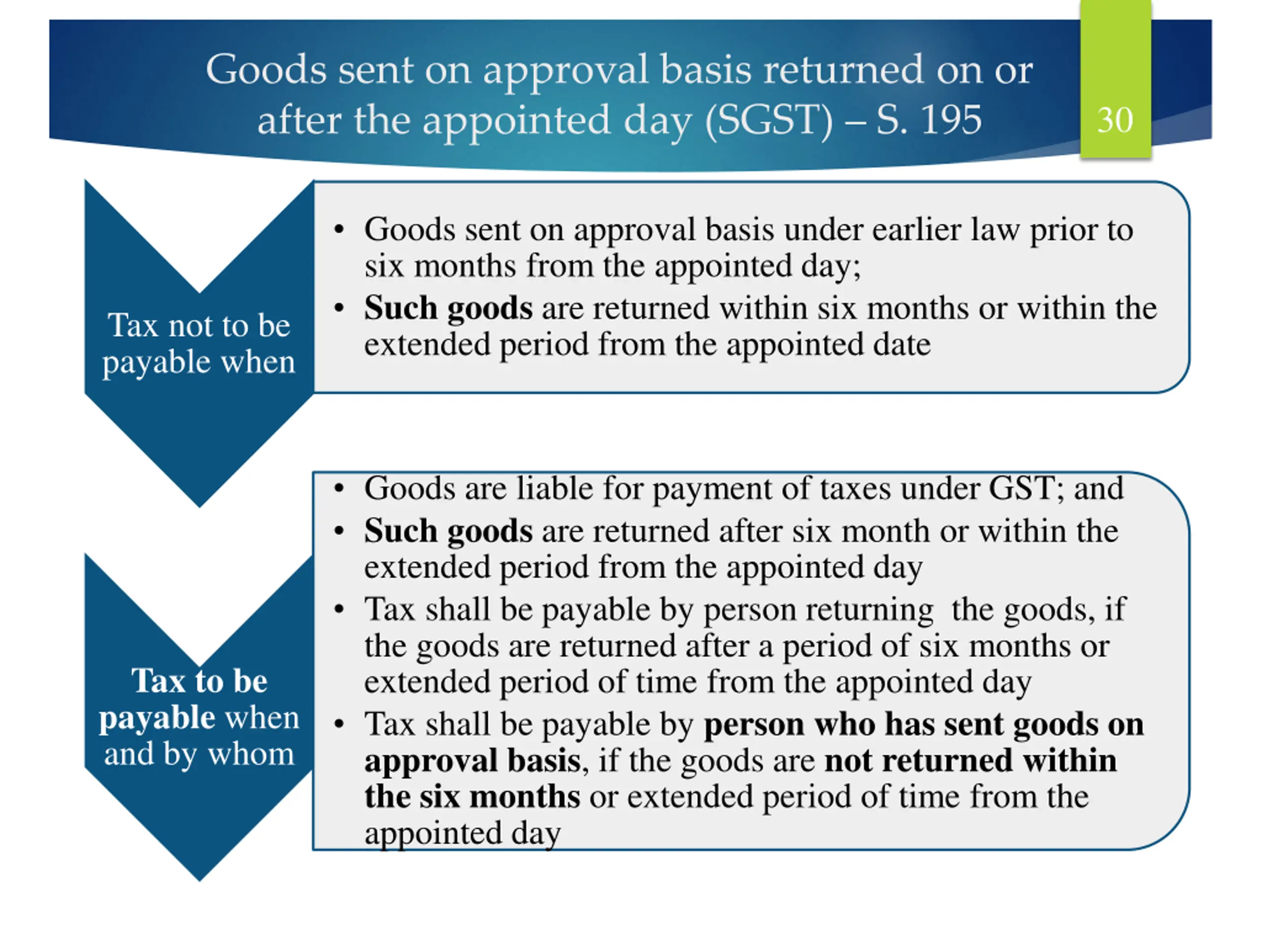 Goods sent on approval basis returned on or after the appointed day (SGST) S. 195 30 Goods sent on approval basis under earlier law prior to six months from the appointed day; Such goods are returned within six months or within the extended period from the appointed date Tax not to be payable when Goods are liable for payment of taxes under GST; and Such goods are returned after six month or within the extended period from the appointed day Tax shall be payable by person returning the goods, if the goods are returned after a period of six months or extended period of time from the appointed day Tax shall be payable by person who has sent goods on approval basis, if the goods are not returned within the six months or extended period of time from the appointed day Tax to be payable when and by whom