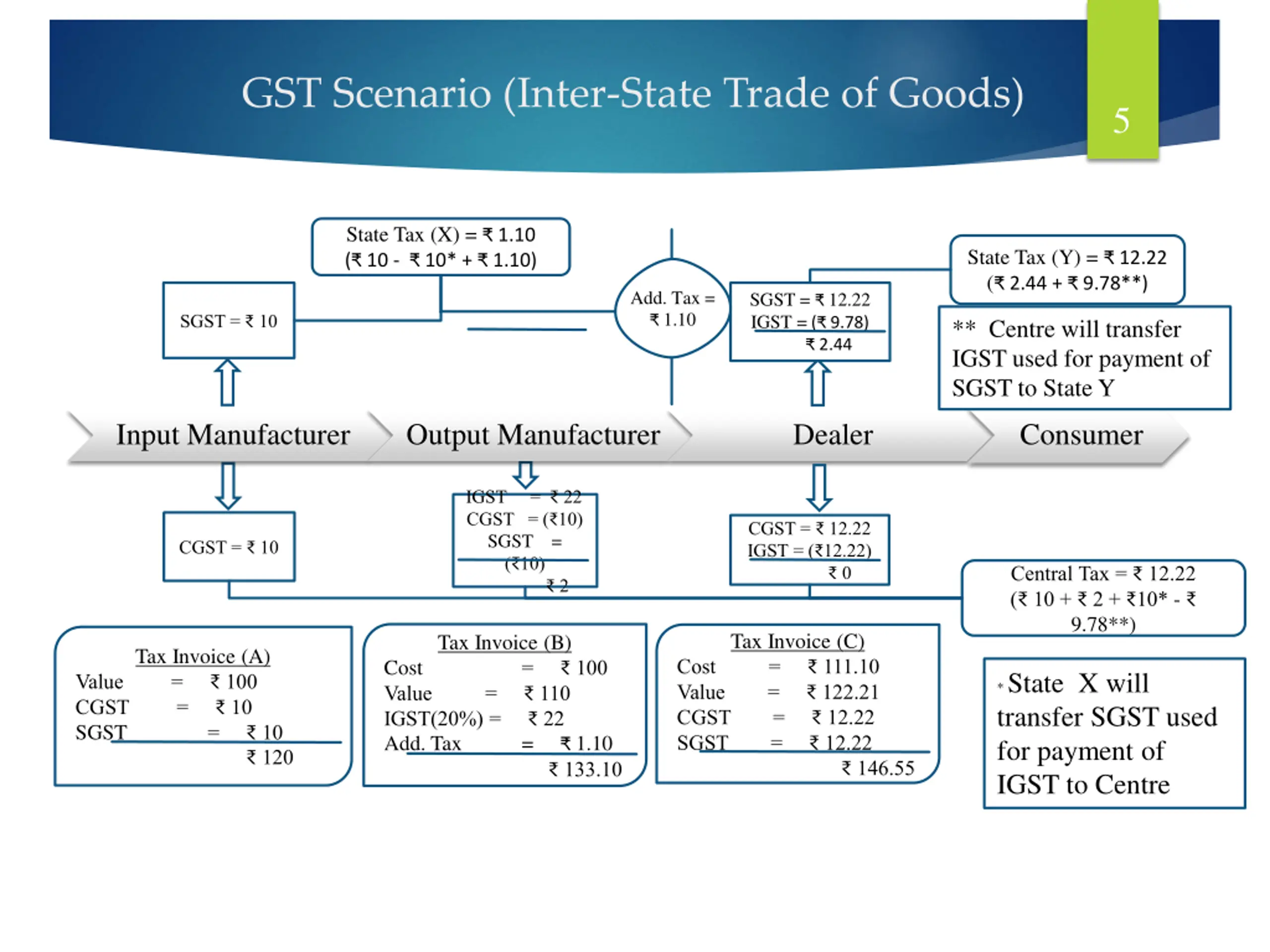 Present Scenario (Inter-State Trade of Goods) 4 State Tax (X) = 2.42 +(8.58-Refund Claim) State Tax (Y) = 16.91 ( 13.91 + 3) Entry Tax = 3 CST = 2.42 ITC = ( 2.42) 0 VAT = 11 VAT = 13.91 Input Manufacturer Output Manufacturer Dealer Consumer Excise = 11 ITC = ( 10) 1 Excise = 10 Central Tax = 11 ( 10 + 1) Tax Invoice (B) Cost = 100 Value = 110 Excise = 11 CST = 2.42 123.42 Tax Invoice (C) Cost = 126.42 Value = 139.06 VAT = 13.91 152.97 Tax Invoice (A) Value = 100 Excise = 10 VAT = 11 121