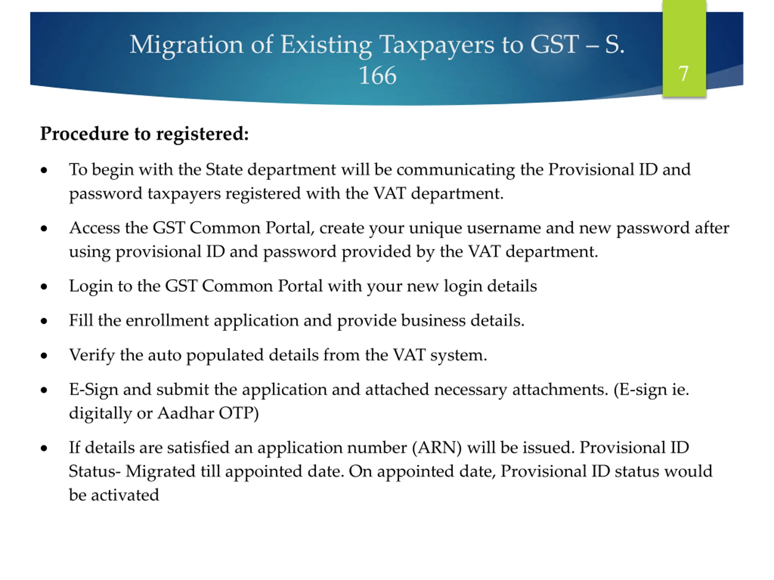 Migration of Existing Taxpayers to GST S. 166 7 Procedure to registered: To begin with the State department will be communicating the Provisional ID and password taxpayers registered with the VAT department. Access the GST Common Portal, create your unique username and new password after using provisional ID and password provided by the VAT department. Login to the GST Common Portal with your new login details Fill the enrollment application and provide business details. Verify the auto populated details from the VAT system. E-Sign and submit the application and attached necessary attachments. (E-sign ie. digitally or Aadhar OTP) If details are satisfied an application number (ARN) will be issued. Provisional ID Status- Migrated till appointed date. On appointed date, Provisional ID status would be activated
