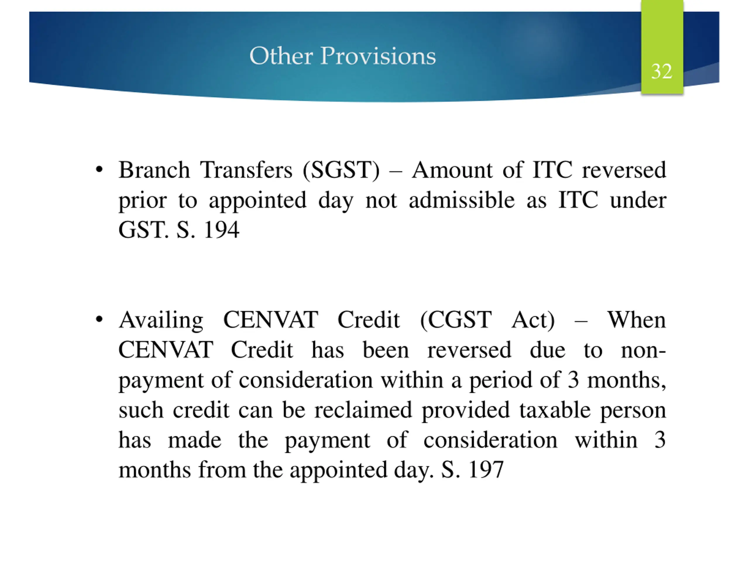 Other Provisions 32 Branch Transfers (SGST) Amount of ITC reversed prior to appointed day not admissible as ITC under GST. S. 194 Availing CENVAT Credit (CGST Act) When CENVAT Credit has been reversed due to non- payment of consideration within a period of 3 months, such credit can be reclaimed provided taxable person has made the payment of consideration within 3 months from the appointed day. S. 197