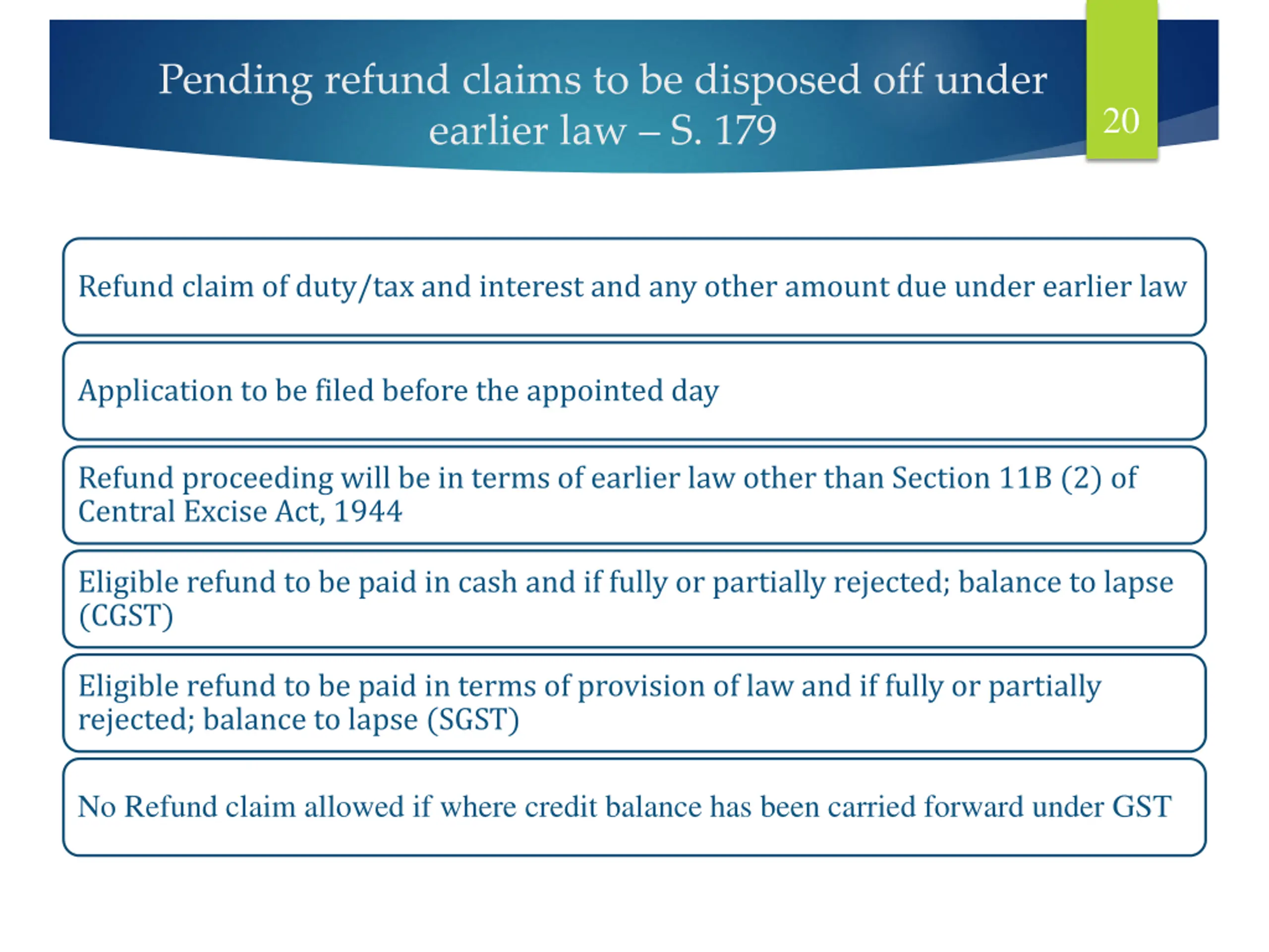 Pending refund claims to be disposed off under earlier law S. 179 20 Refund claim of duty/tax and interest and any other amount due under earlier law Application to be filed before the appointed day Refund proceeding will be in terms of earlier law other than Section 11B (2) of Central Excise Act, 1944 Eligible refund to be paid in cash and if fully or partially rejected; balance to lapse (CGST) Eligible refund to be paid in terms of provision of law and if fully or partially rejected; balance to lapse (SGST) No Refund claim allowed if where credit balance has been carried forward under GST
