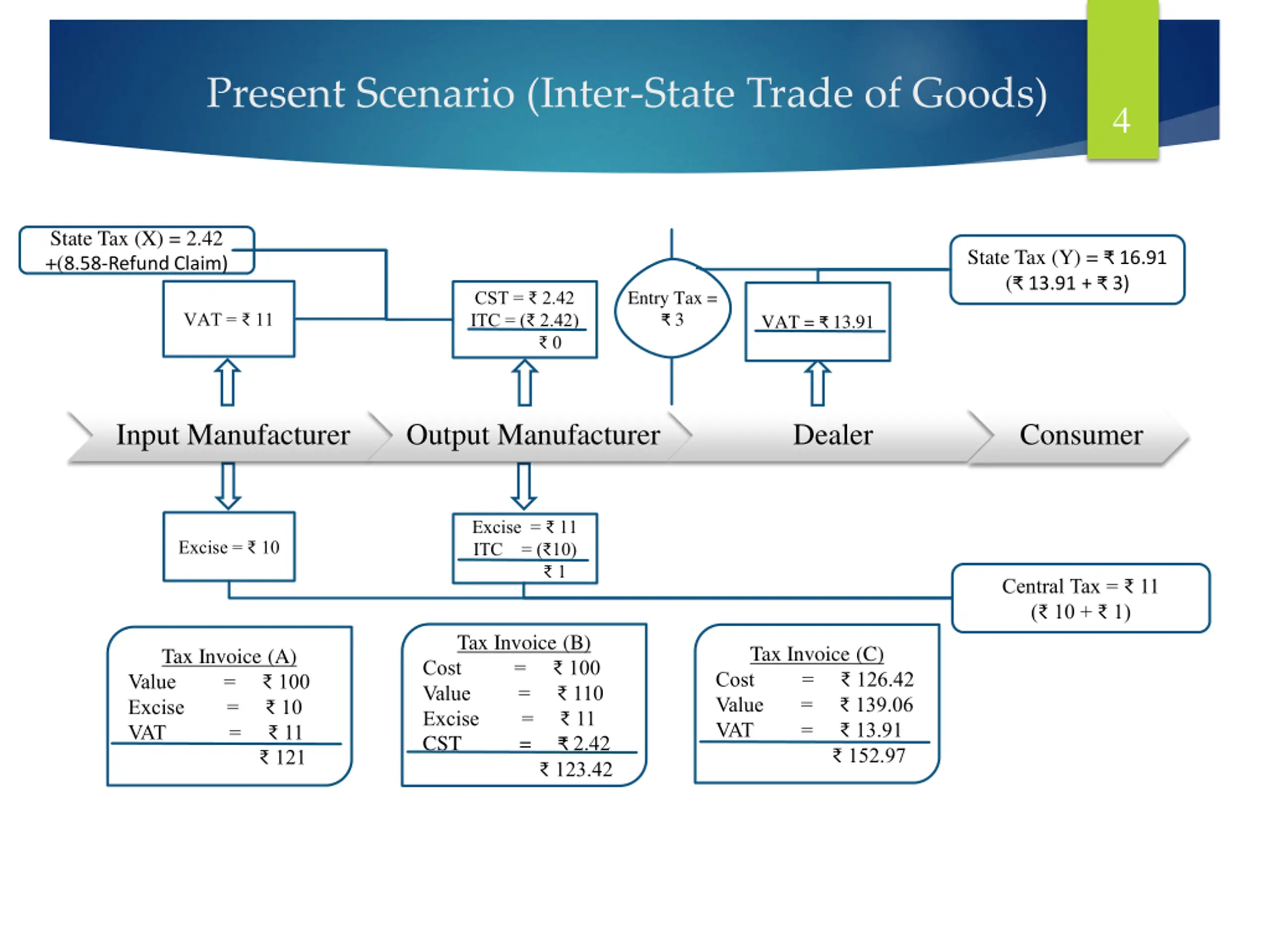 GST Scenario (Intra-State Trade of Goods) 3 State Tax = 12.10 ( 10 + 1 + 1.10) SGST = 11 ITC = ( 10) 1 SGST = 12.10 ITC =( 11) 1.10 SGST = 10 Input Manufacturer Output Manufacturer Dealer Consumer CGST = 12.10 ITC = ( 11) 1.10 CGST = 11 ITC = ( 10) 1 CGST = 10 Central Tax = 12.10 ( 10 + 1 + 1.10) Tax Invoice (C) Cost = 110 Value = 121 CGST = 12.10 SGST = 12.10 145.20 Tax Invoice (B) Cost = 100 Value = 110 CGST = 11 SGST 11 132 Tax Invoice (A) Value = 100 CGST = 10 SGST = 10 120