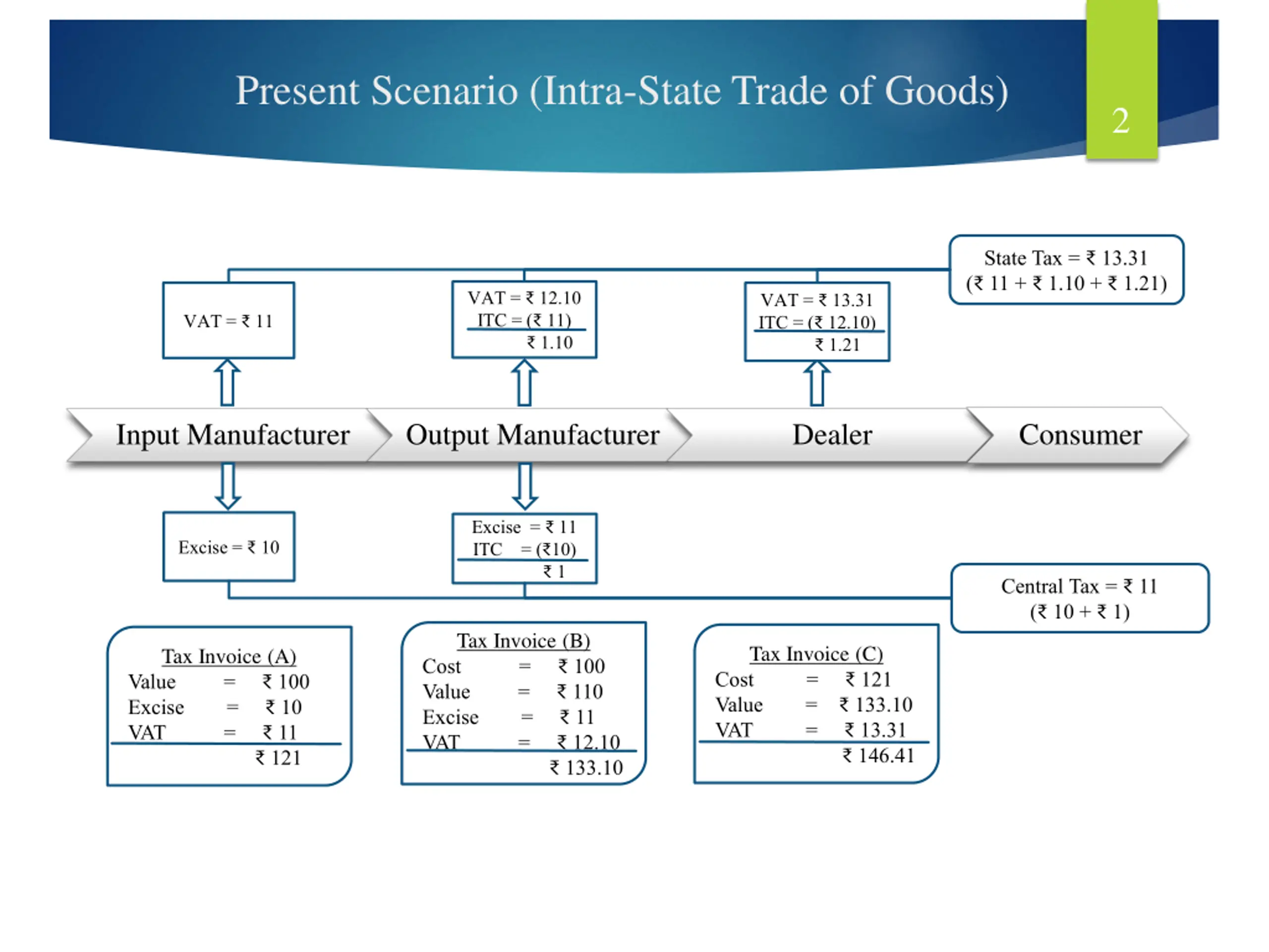 Present Scenario (Intra-State Trade of Goods) 2 State Tax = 13.31 ( 11 + 1.10 + 1.21) VAT = 12.10 ITC = ( 11) 1.10 VAT = 13.31 ITC = ( 12.10) 1.21 VAT = 11 Input Manufacturer Output Manufacturer Dealer Consumer Excise = 11 ITC = ( 10) 1 Excise = 10 Central Tax = 11 ( 10 + 1) Tax Invoice (B) Cost = 100 Value = 110 Excise = 11 VAT = 12.10 Tax Invoice (C) Cost = 121 Value = 133.10 VAT = 13.31 Tax Invoice (A) Value = 100 Excise = 10 VAT = 11 146.41 121 133.10