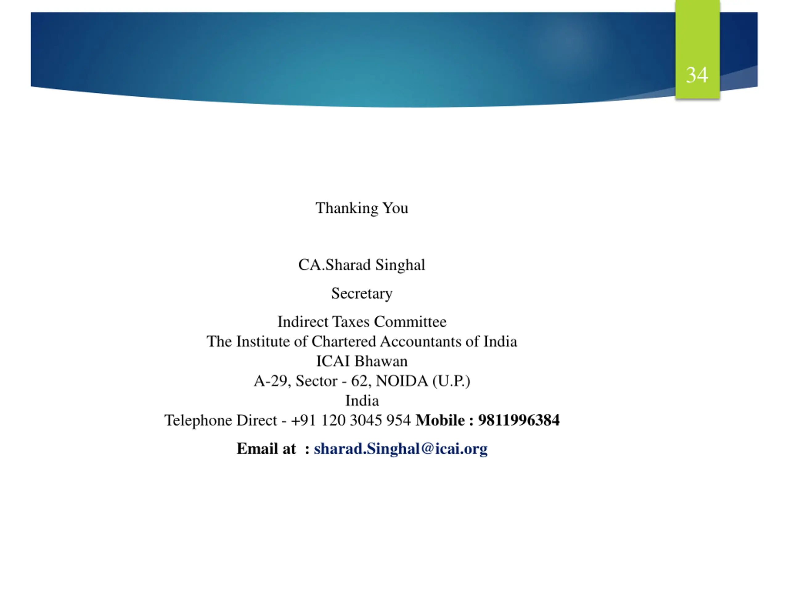 34 Thanking You CA.Sharad Singhal Secretary Indirect Taxes Committee The Institute of Chartered Accountants of India ICAI Bhawan A-29, Sector - 62, NOIDA (U.P.) India Telephone Direct - +91 120 3045 954 Mobile : 9811996384 Email at : sharad.Singhal@icai.org