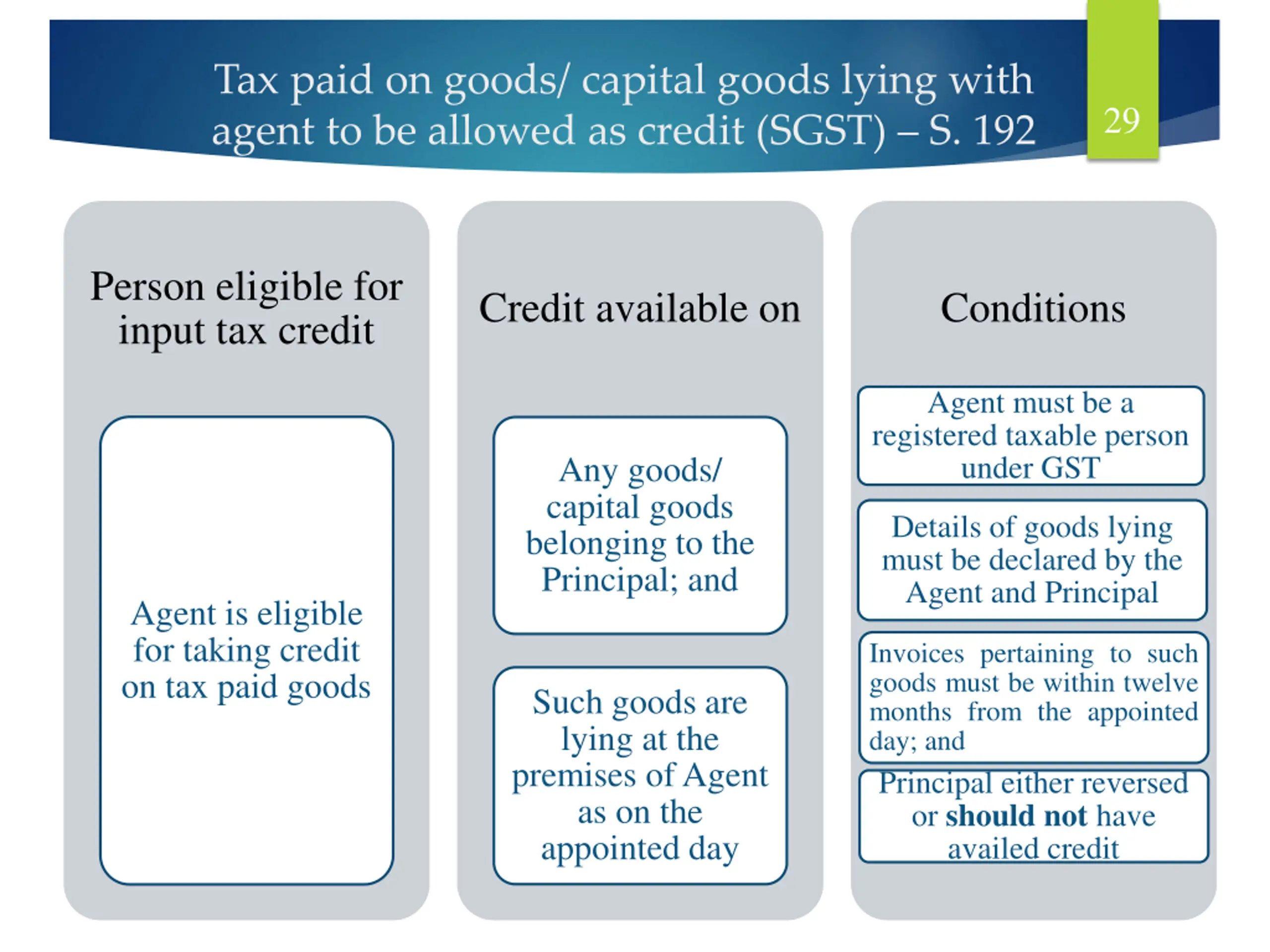 Tax paid on goods/ capital goods lying with agent to be allowed as credit (SGST) S. 192 29 Person eligible for input tax credit Credit available on Conditions Agent must be a registered taxable person under GST Any goods/ capital goods belonging to the Principal; and Details of goods lying must be declared by the Agent and Principal Agent is eligible for taking credit on tax paid goods Invoices pertaining to such goods must be within twelve months from the appointed day; and Principal either reversed or should not have availed credit Such goods are lying at the premises of Agent as on the appointed day