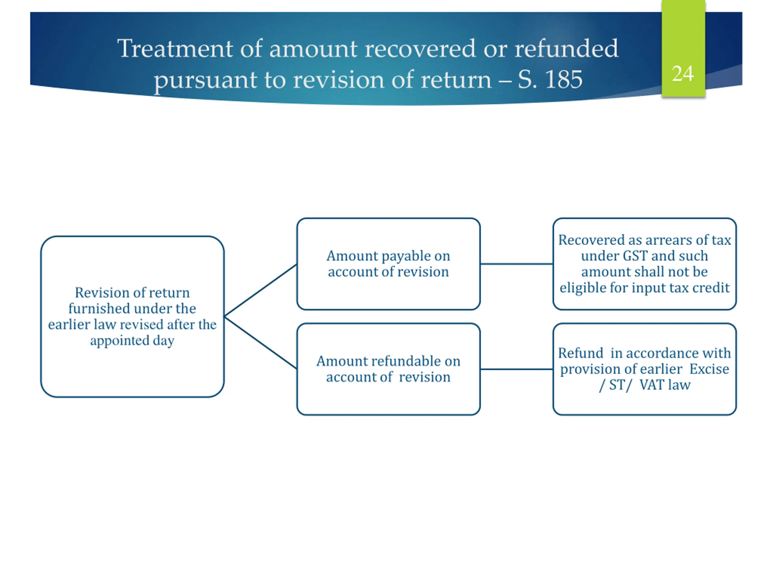 Treatment of amount recovered or refunded pursuant to revision of return S. 185 24 Recovered as arrears of tax under GST and such amount shall not be eligible for input tax credit Amount payable on account of revision Revision of return furnished under the earlier law revised after the appointed day Refund in accordance with provision of earlier Excise / ST/ VAT law Amount refundable on account of revision