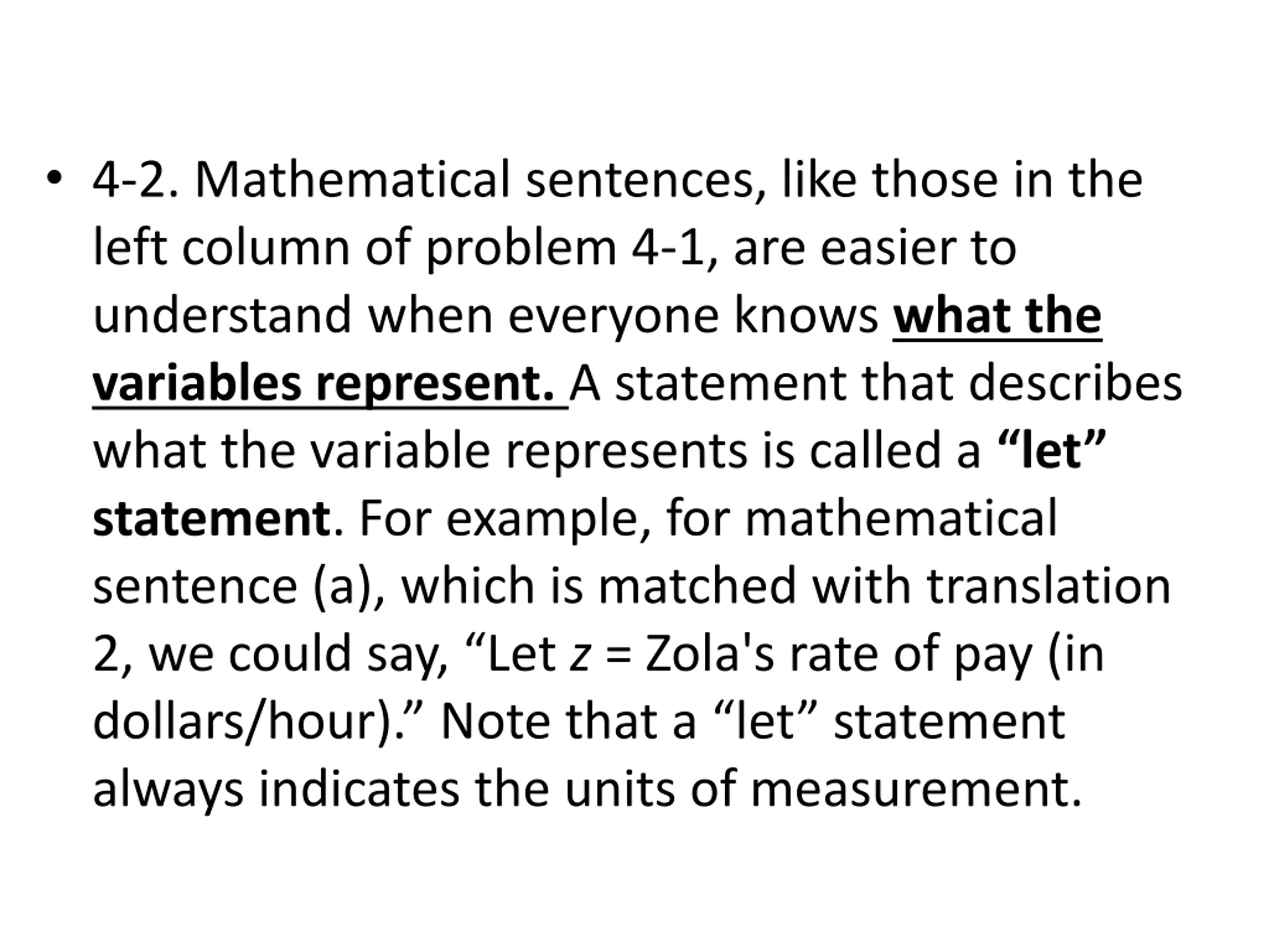 4-2. Mathematical sentences, like those in the left column of problem 4-1, are easier to understand when everyone knows what the variables represent. A statement that describes what the variable represents is called a let statement. For example, for mathematical sentence (a), which is matched with translation 2, we could say, Let z = Zola's rate of pay (in dollars/hour). Note that a let statement always indicates the units of measurement.