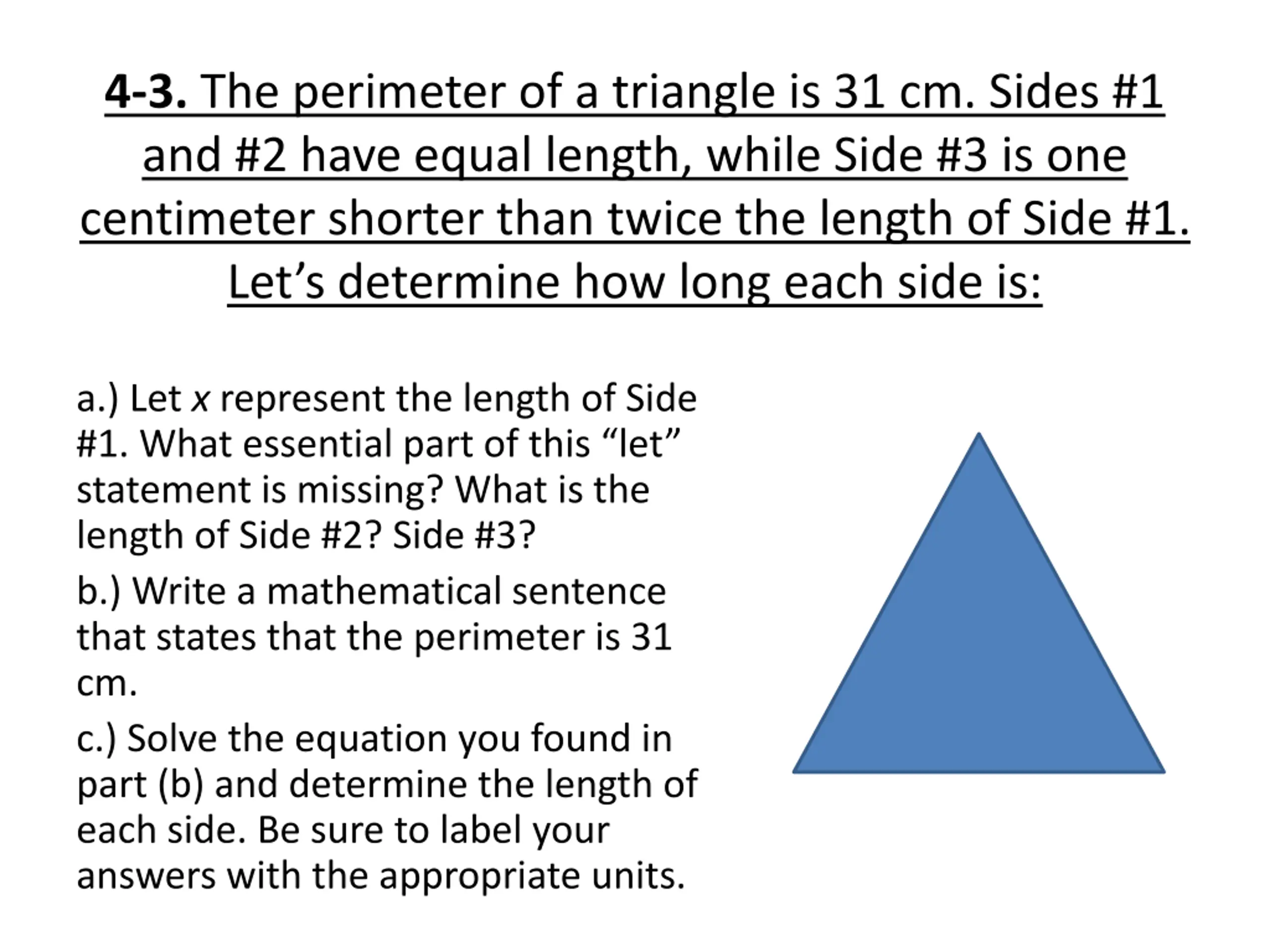 4-3. The perimeter of a triangle is 31 cm. Sides #1 and #2 have equal length, while Side #3 is one centimeter shorter than twice the length of Side #1. Let s determine how long each side is: a.) Let x represent the length of Side #1. What essential part of this let statement is missing? What is the length of Side #2? Side #3? b.) Write a mathematical sentence that states that the perimeter is 31 cm. c.) Solve the equation you found in part (b) and determine the length of each side. Be sure to label your answers with the appropriate units.
