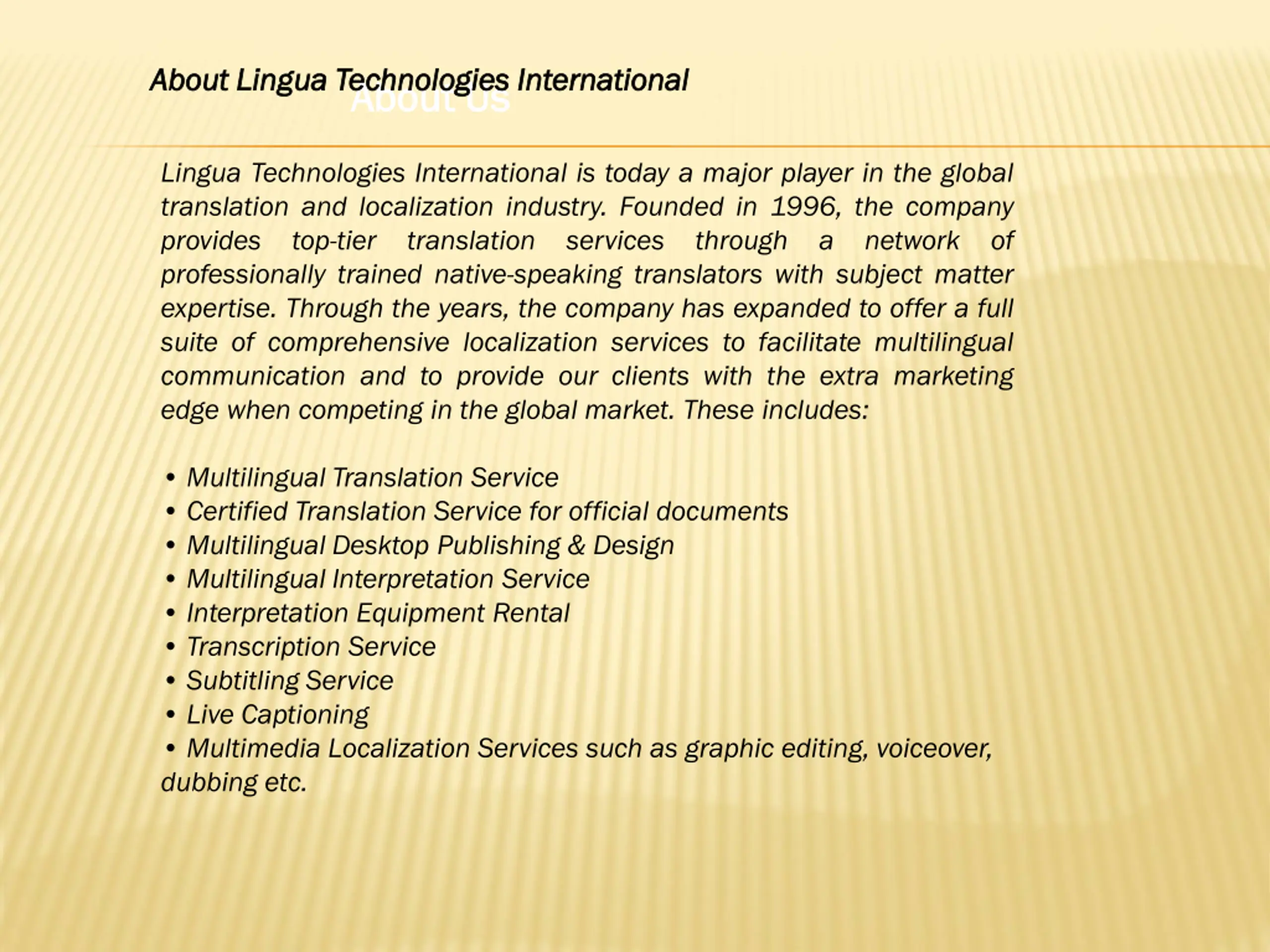 About Lingua Technologies International About Lingua Technologies International About Us About Us Lingua Technologies International is today a major player in the global translation and localization industry. Founded in 1996, the company provides top-tier translation services through a network of professionally trained native-speaking translators with subject matter expertise. Through the years, the company has expanded to offer a full suite of comprehensive localization services to facilitate multilingual communication and to provide our clients with the extra marketing edge when competing in the global market. These includes: Multilingual Translation Service Certified Translation Service for official documents Multilingual Desktop Publishing & Design Multilingual Interpretation Service Interpretation Equipment Rental Transcription Service Subtitling Service Live Captioning Multimedia Localization Services such as graphic editing, voiceover, dubbing etc.