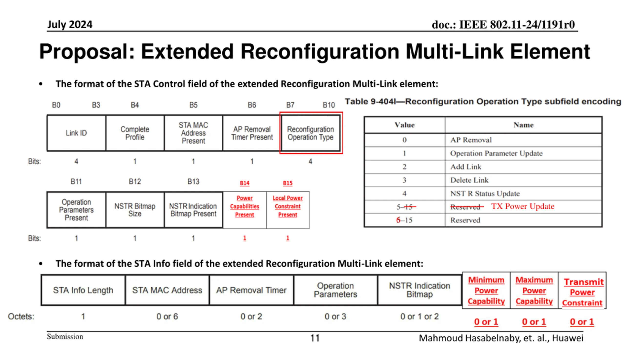 doc.: IEEE 802.11-24/1191r0 July 2024 Proposal: Extended Reconfiguration Multi-Link Element The format of the STA Control field of the extended Reconfiguration Multi-Link element: TX Power Update 6 The format of the STA Info field of the extended Reconfiguration Multi-Link element: 11 Submission Mahmoud Hasabelnaby, et. al., Huawei