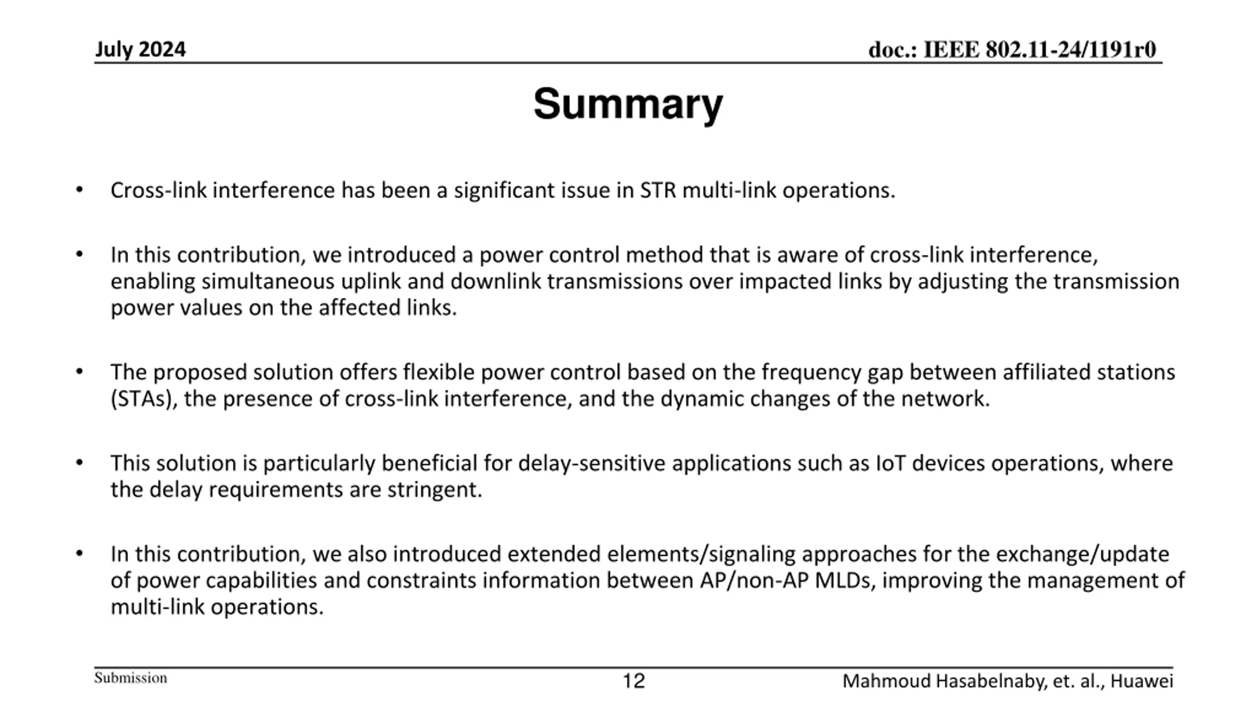 doc.: IEEE 802.11-24/1191r0 July 2024 Summary Cross-link interference has been a significant issue in STR multi-link operations. In this contribution, we introduced a power control method that is aware of cross-link interference, enabling simultaneous uplink and downlink transmissions over impacted links by adjusting the transmission power values on the affected links. The proposed solution offers flexible power control based on the frequency gap between affiliated stations (STAs), the presence of cross-link interference, and the dynamic changes of the network. This solution is particularly beneficial for delay-sensitive applications such as IoT devices operations, where the delay requirements are stringent. In this contribution, we also introduced extended elements/signaling approaches for the exchange/update of power capabilities and constraints information between AP/non-AP MLDs, improving the management of multi-link operations. 12 Submission Mahmoud Hasabelnaby, et. al., Huawei