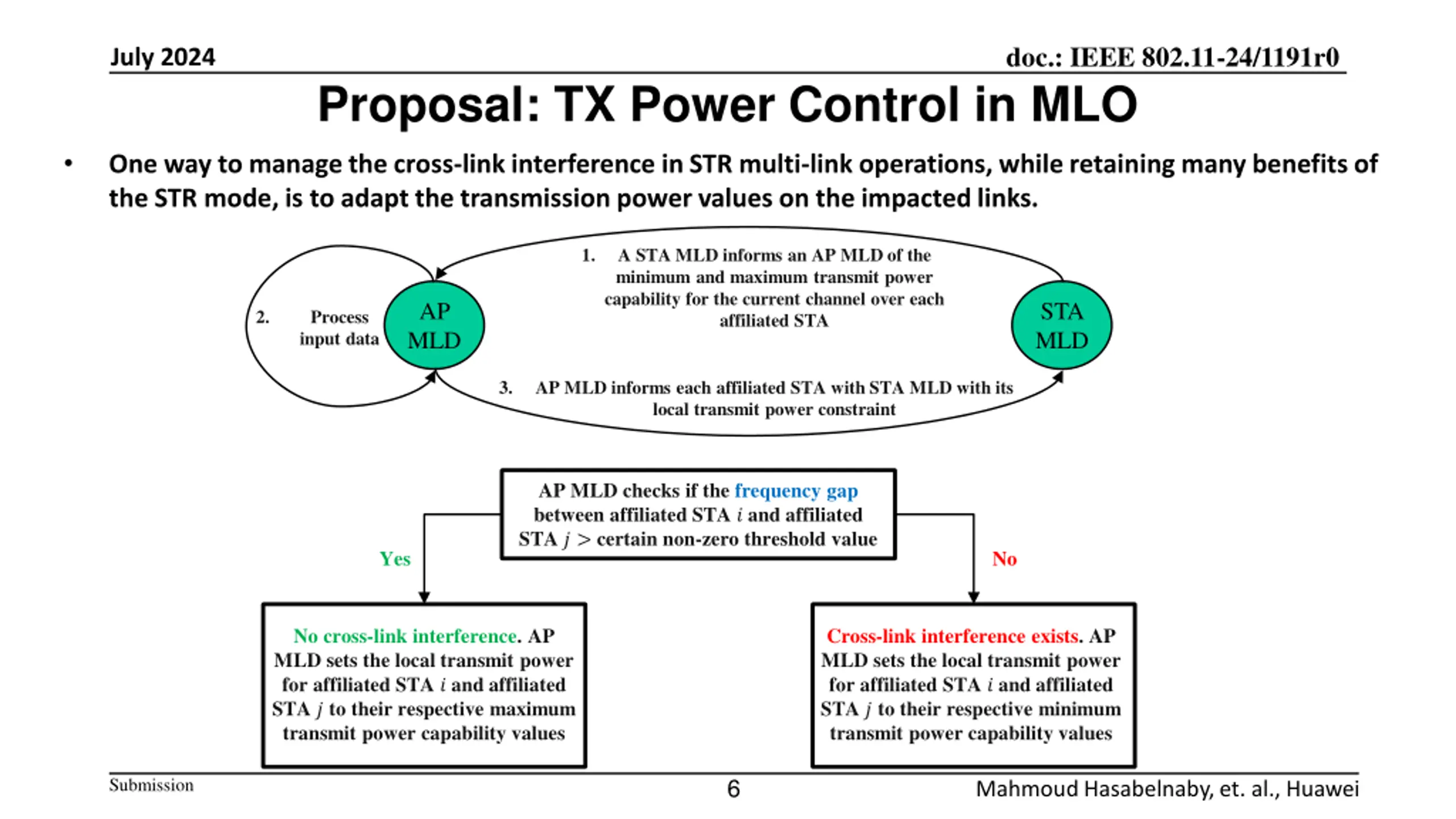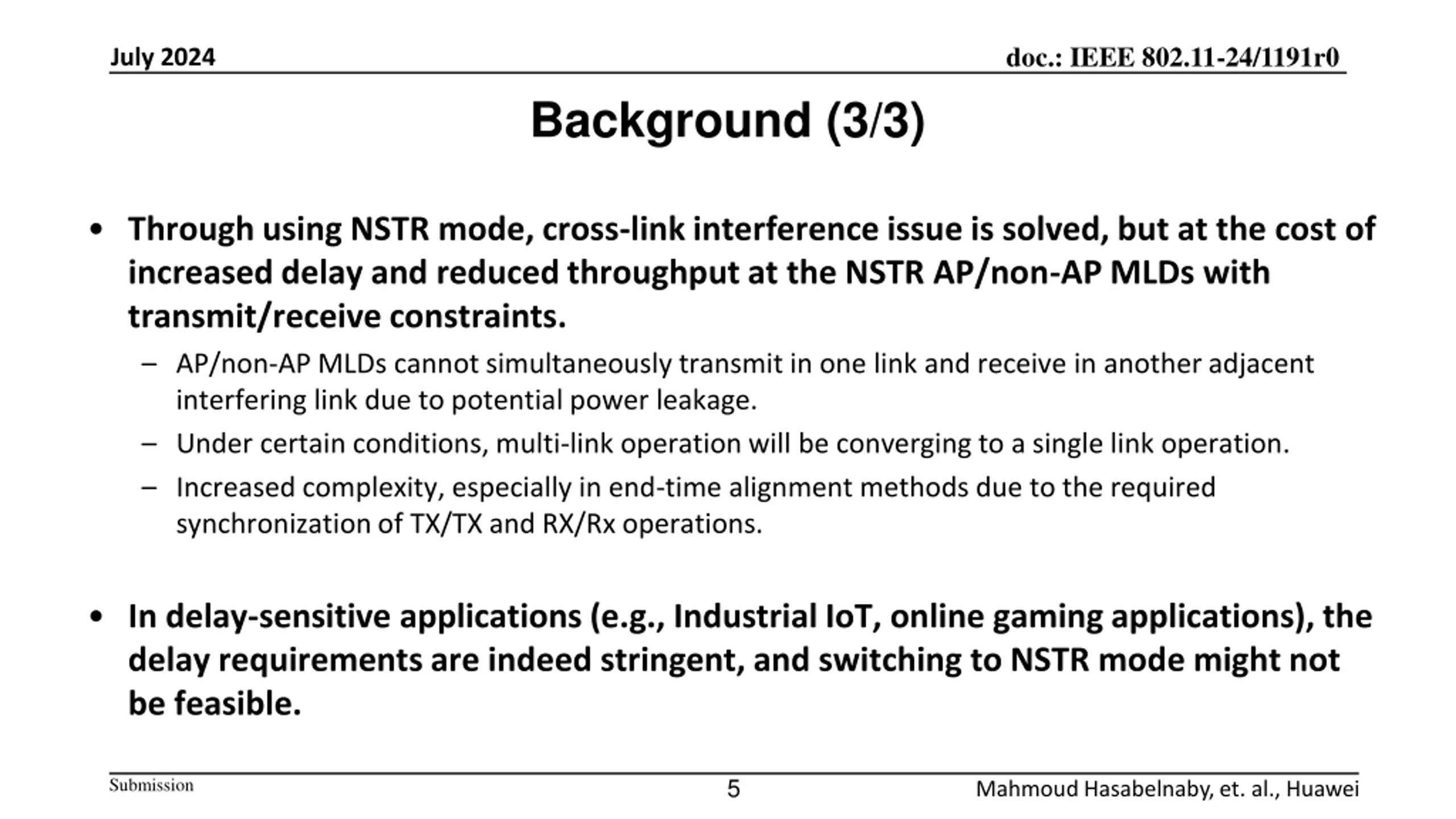 doc.: IEEE 802.11-24/1191r0 July 2024 Background (3/3) Through using NSTR mode, cross-link interference issue is solved, but at the cost of increased delay and reduced throughput at the NSTR AP/non-AP MLDs with transmit/receive constraints. AP/non-AP MLDs cannot simultaneously transmit in one link and receive in another adjacent interfering link due to potential power leakage. Under certain conditions, multi-link operation will be converging to a single link operation. Increased complexity, especially in end-time alignment methods due to the required synchronization of TX/TX and RX/Rx operations. In delay-sensitive applications (e.g., Industrial IoT, online gaming applications), the delay requirements are indeed stringent, and switching to NSTR mode might not be feasible. 5 Submission Mahmoud Hasabelnaby, et. al., Huawei